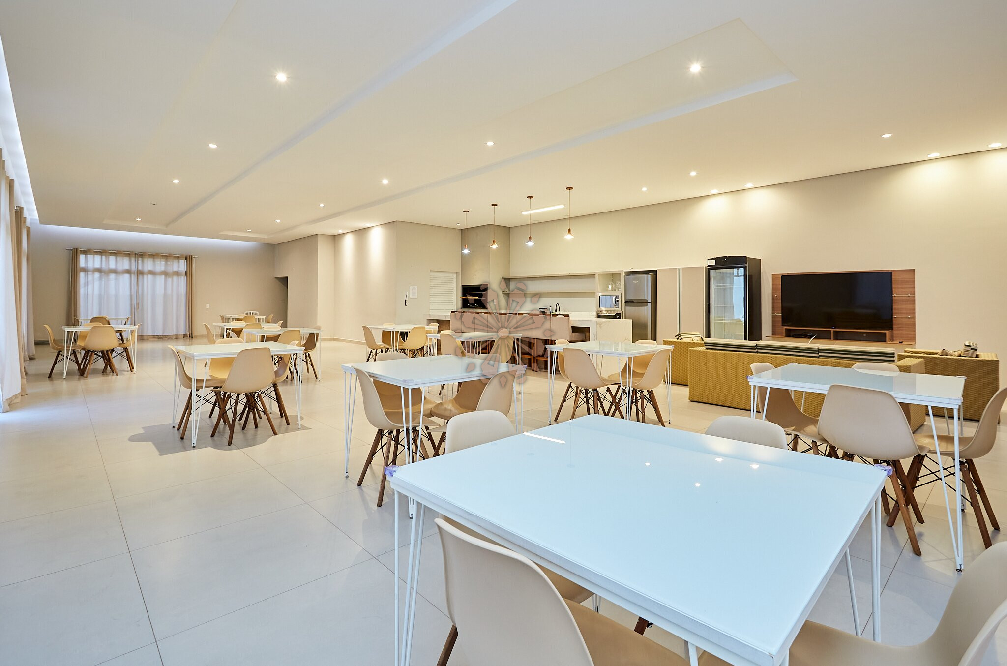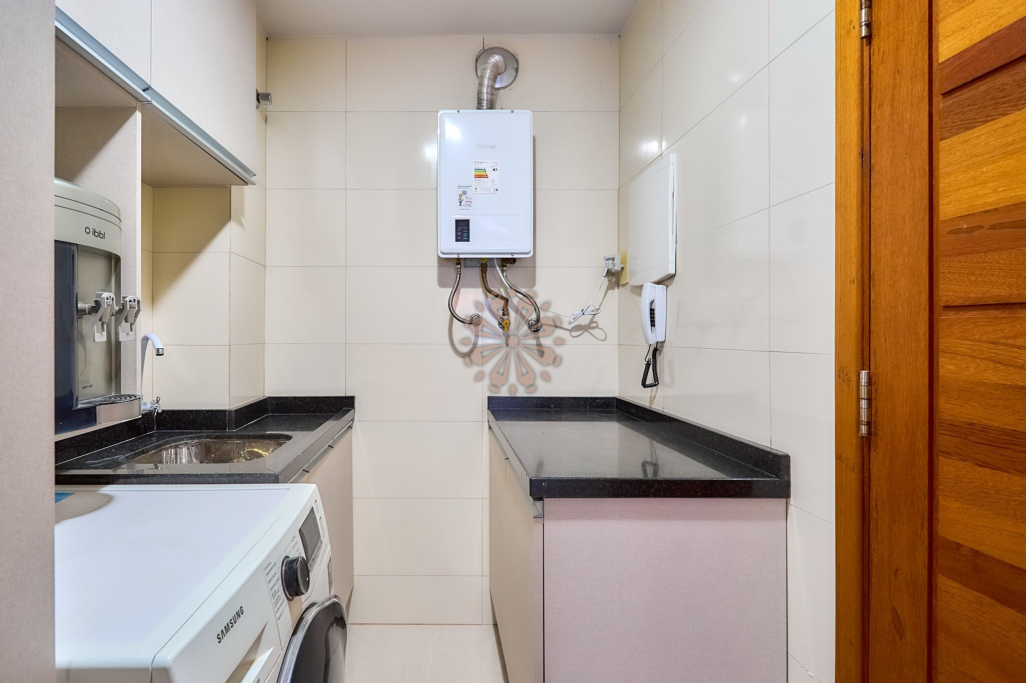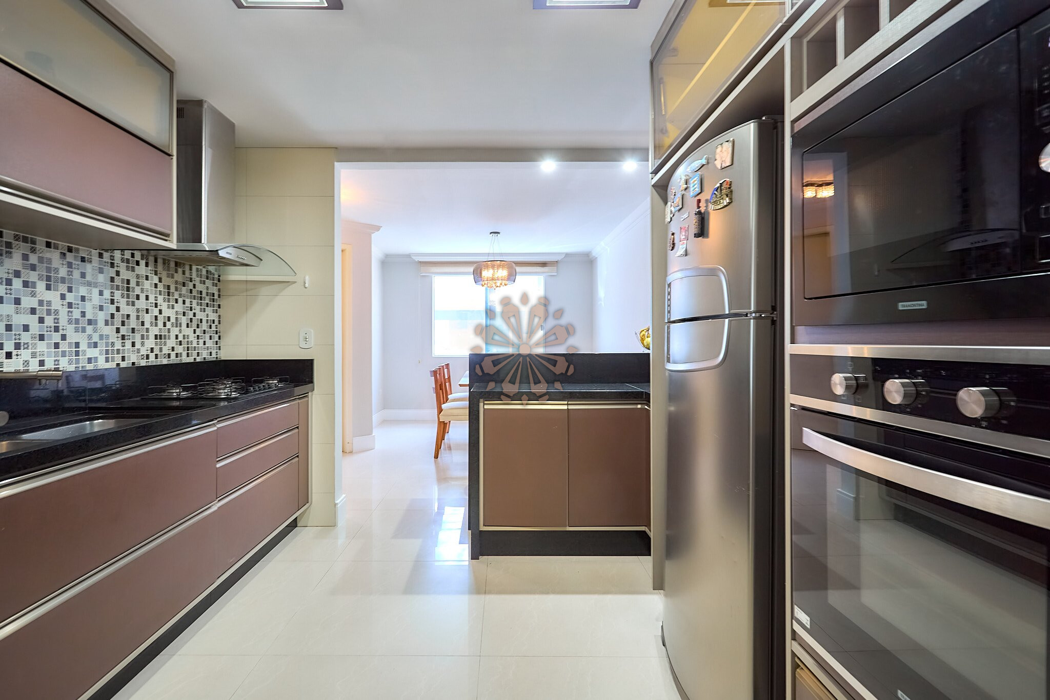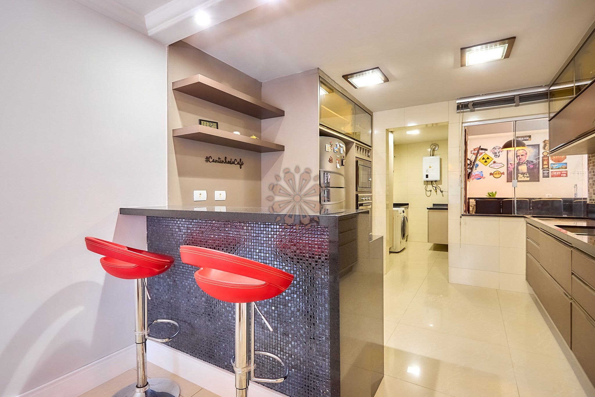 O espaço interno é bem distribuído, com sala de estar equipada com sofá, hack e televisão, sala de jantar com mesa para 5 lugares e balcão com banquetas, cozinha com armários planejados, coifa, geladeira, micro-ondas e forno. Possui lavabo e lavanderia equipada com máquina de lavar e móveis planejados. As sacadas contam com tela de proteção para pets e crianças e portõezinhos de segurança nas escadas.