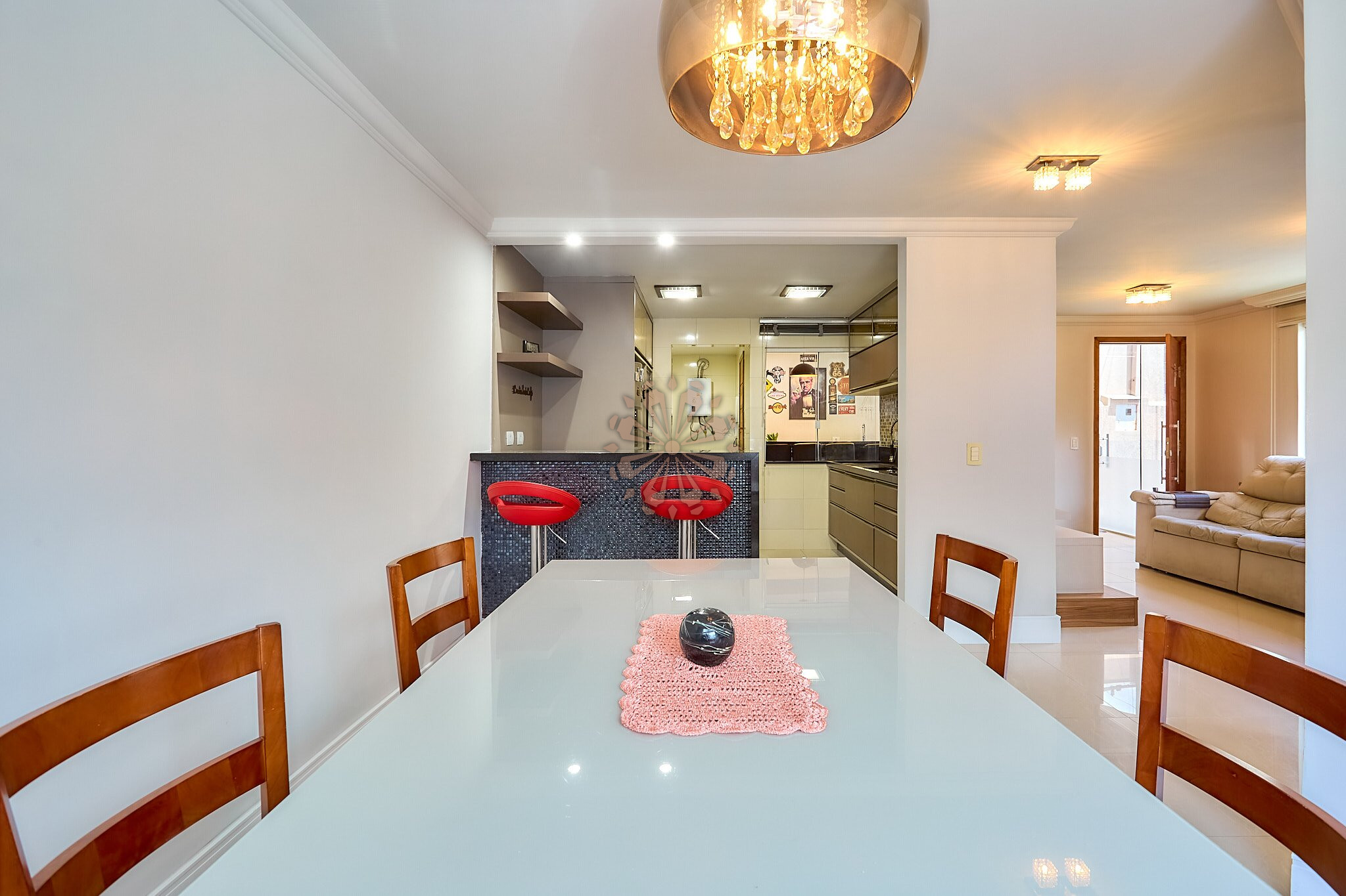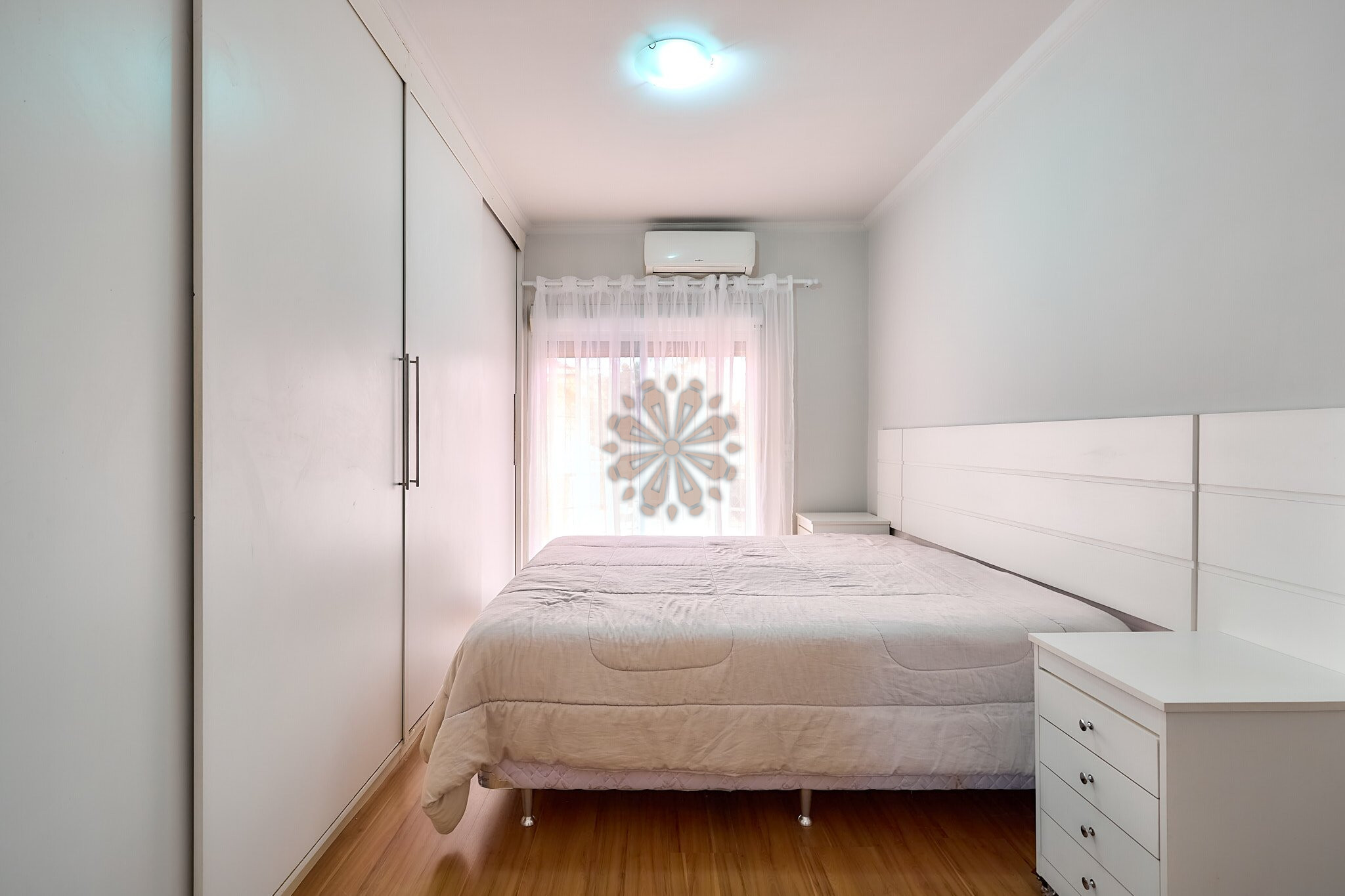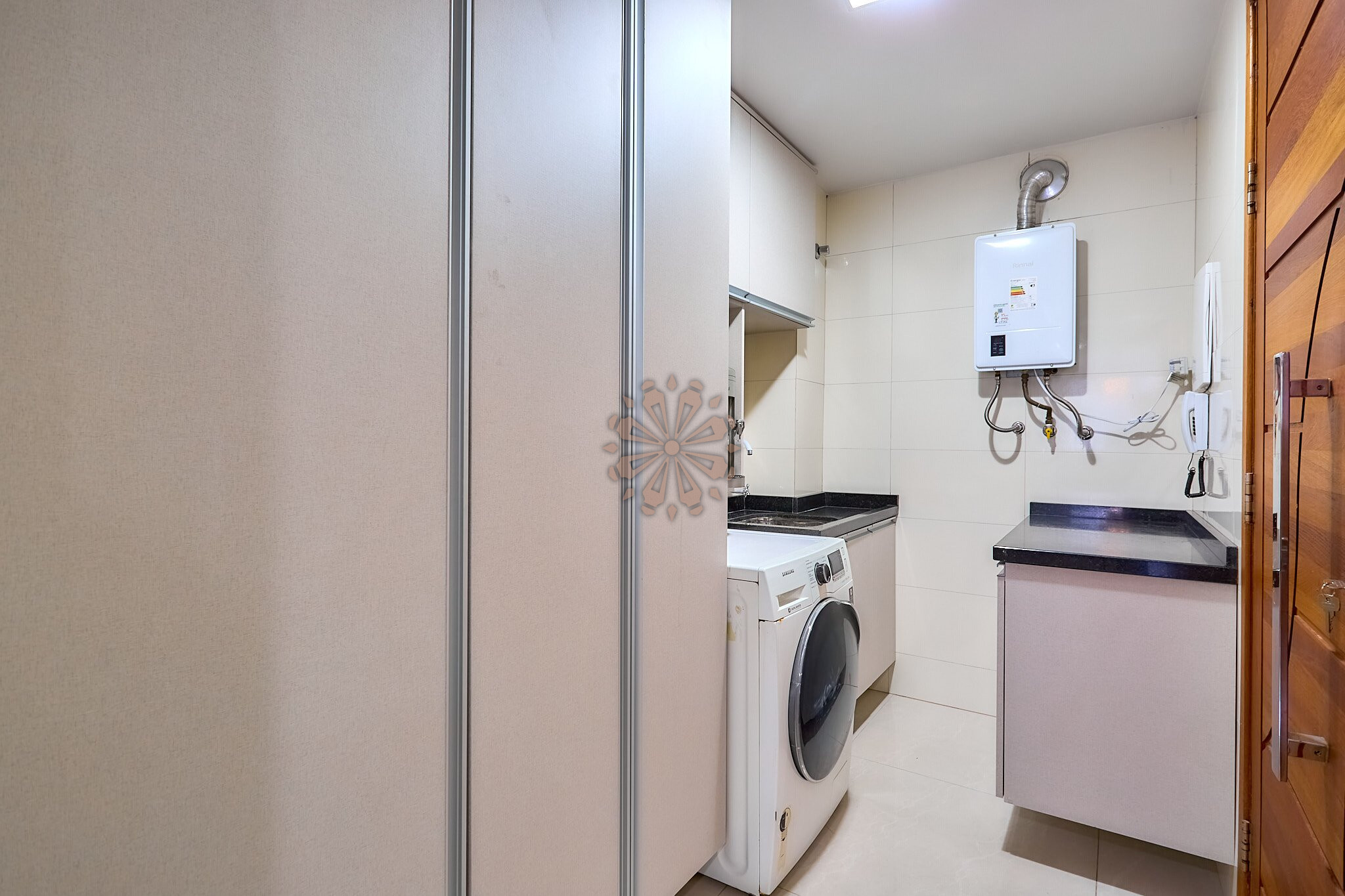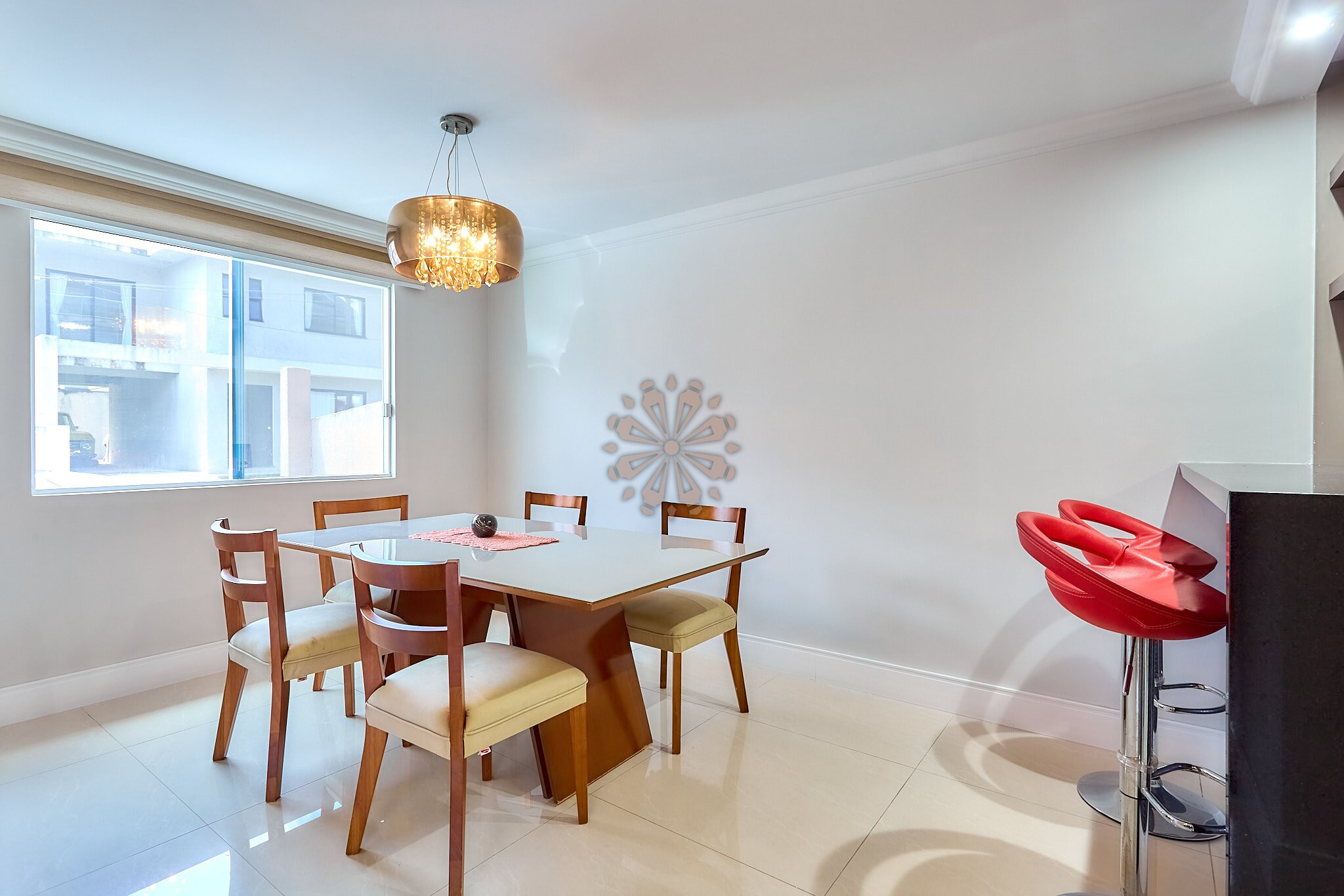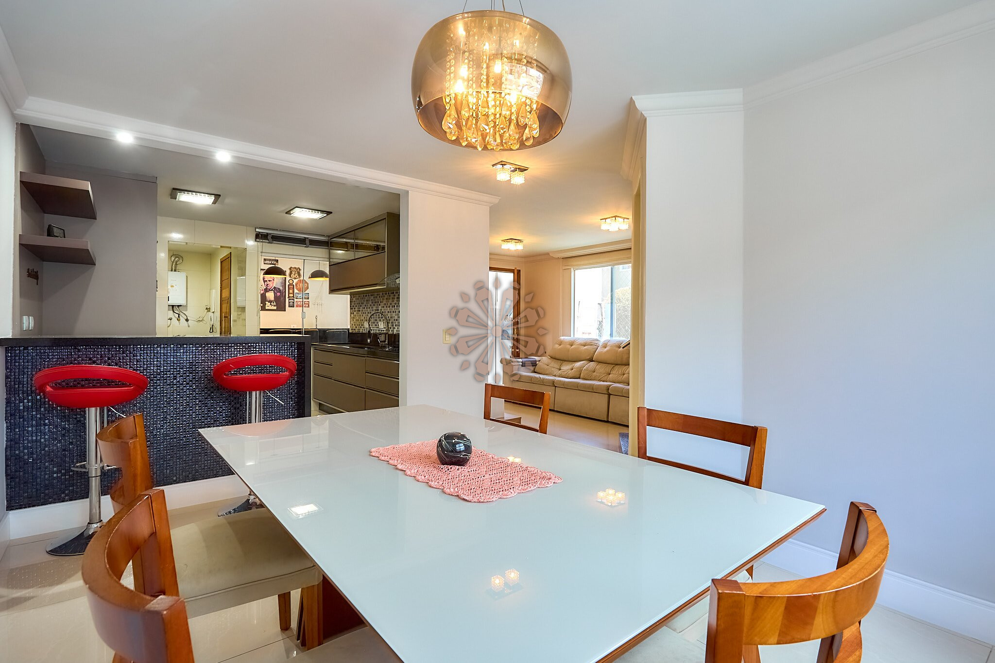 O espaço interno é bem distribuído, com sala de estar equipada com sofá, hack e televisão, sala de jantar com mesa para 5 lugares e balcão com banquetas, cozinha com armários planejados, coifa, geladeira, micro-ondas e forno. Possui lavabo e lavanderia equipada com máquina de lavar e móveis planejados. As sacadas contam com tela de proteção para pets e crianças e portõezinhos de segurança nas escadas.