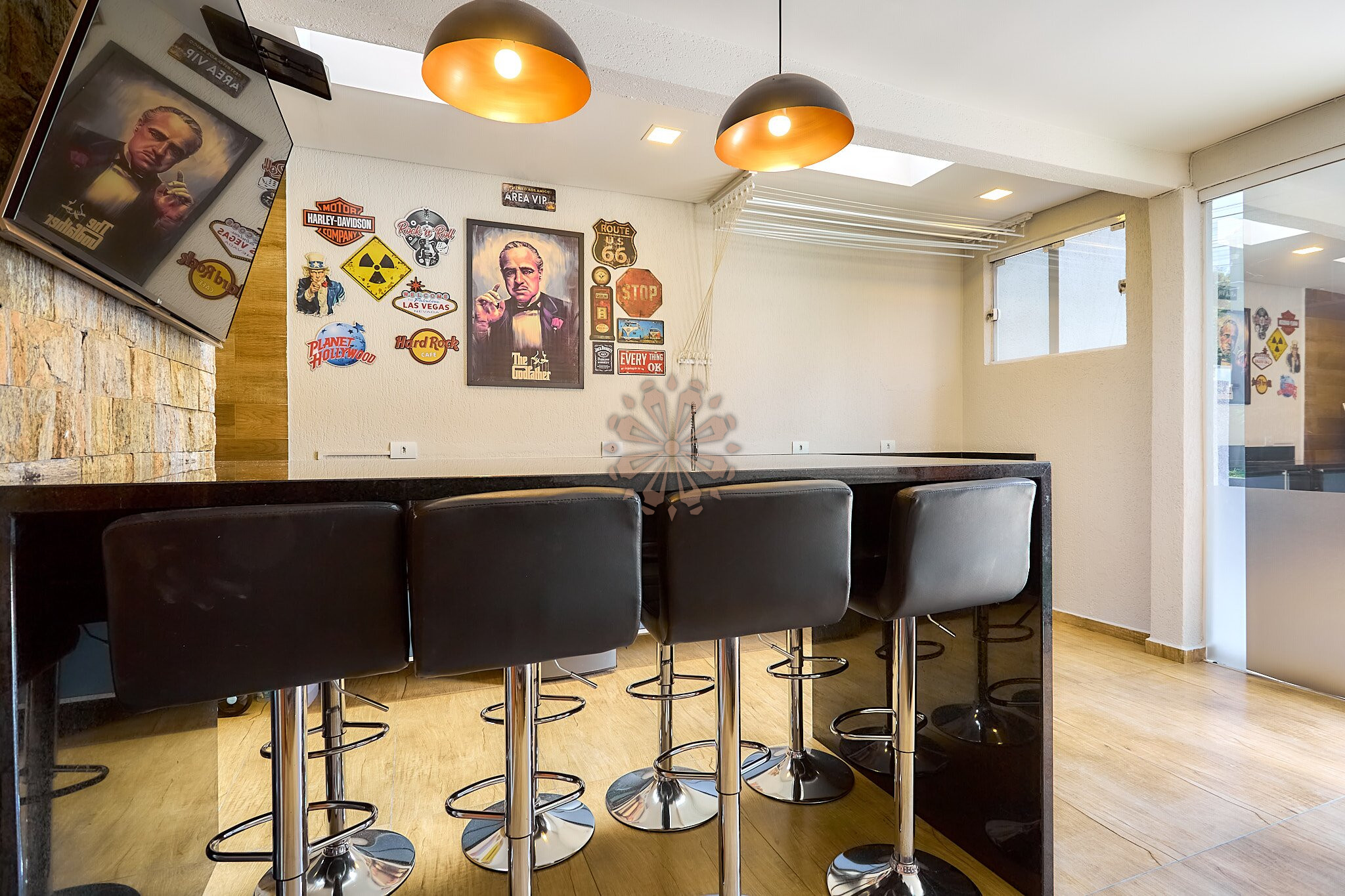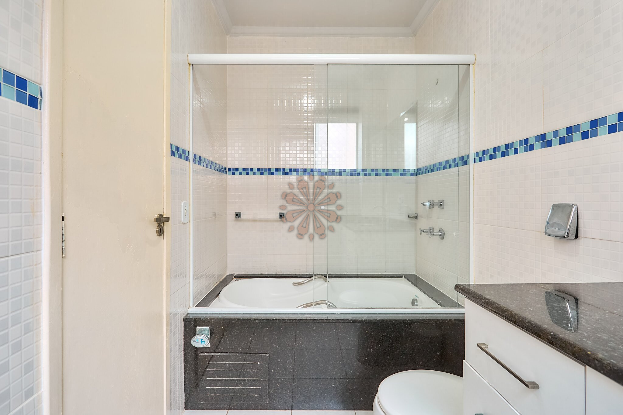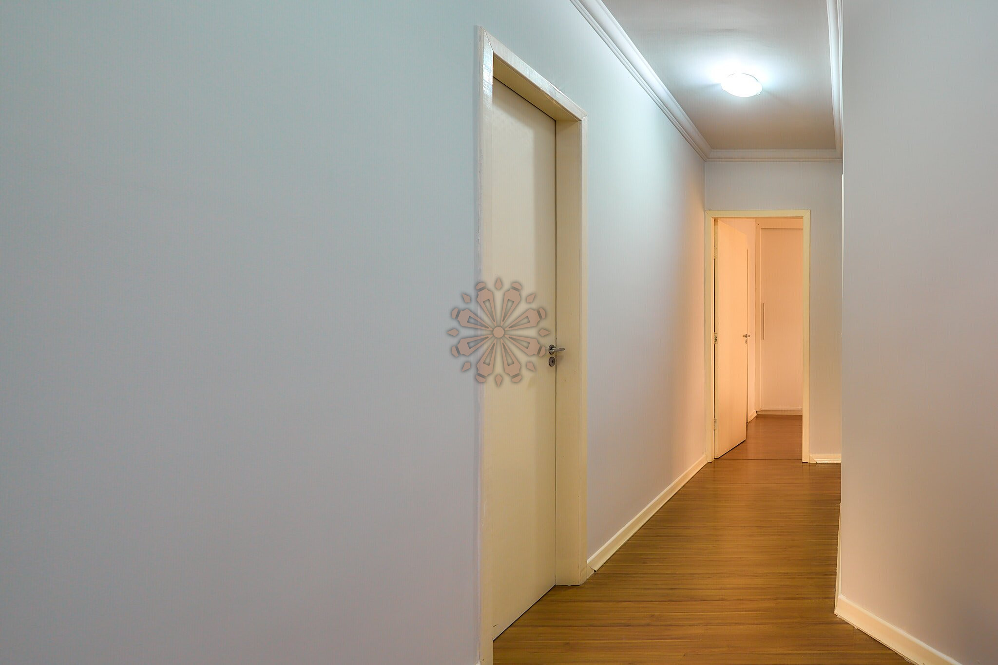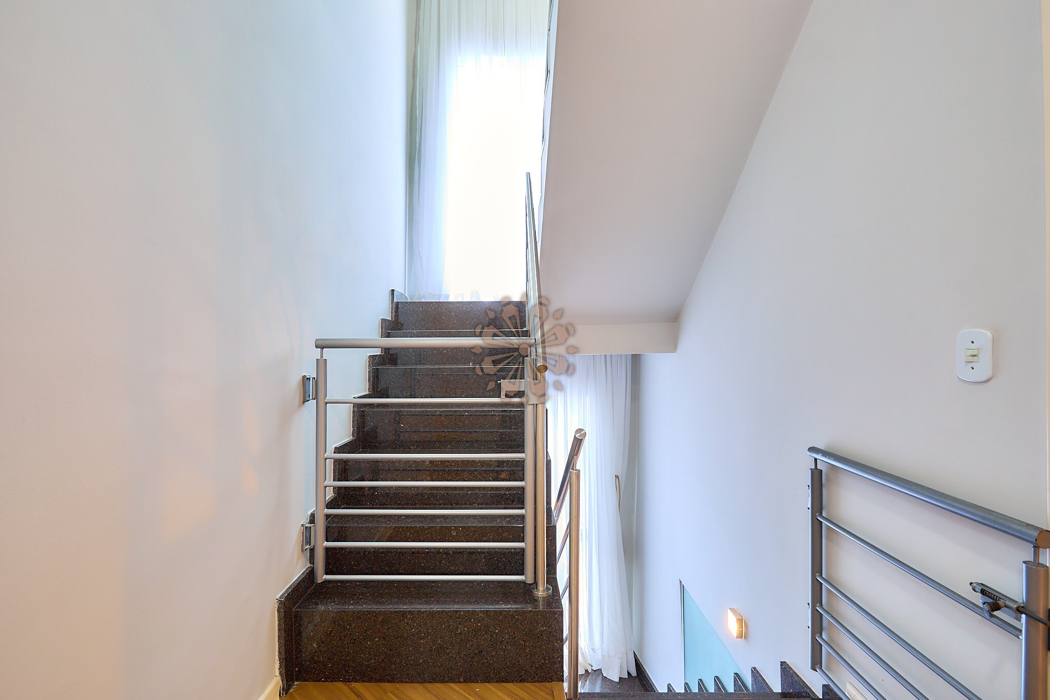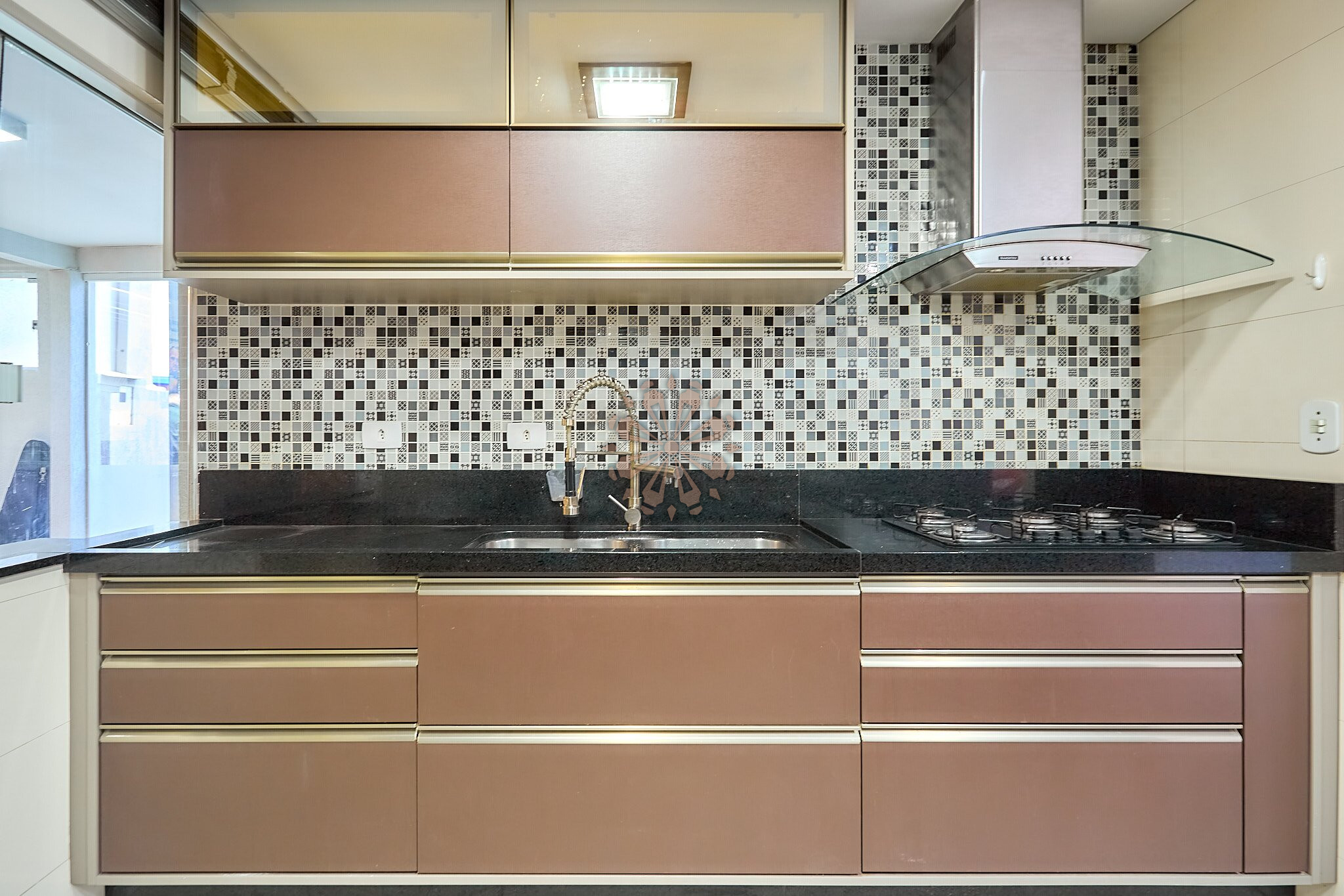 O espaço interno é bem distribuído, com sala de estar equipada com sofá, hack e televisão, sala de jantar com mesa para 5 lugares e balcão com banquetas, cozinha com armários planejados, coifa, geladeira, micro-ondas e forno. Possui lavabo e lavanderia equipada com máquina de lavar e móveis planejados. As sacadas contam com tela de proteção para pets e crianças e portõezinhos de segurança nas escadas.