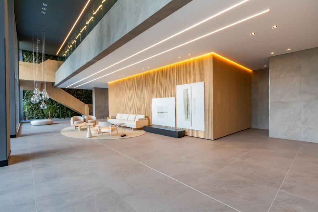 Acabamentos de alto padrão: porcelanato 90x90cm, laminado sofisticado, bancadas em granito e quartzo, metais premium, esquadrias com atenuação acústica e persianas blackout automatizadas.
