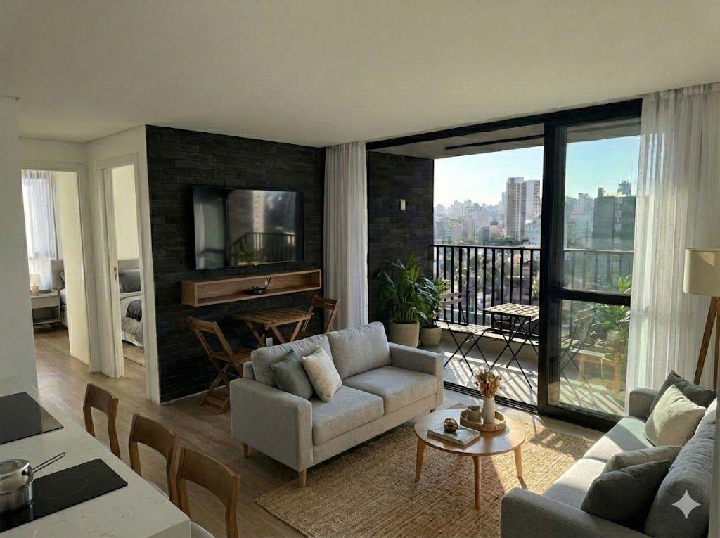 Fotos reais do apartamento com imagens projetadas para simular ambientes.