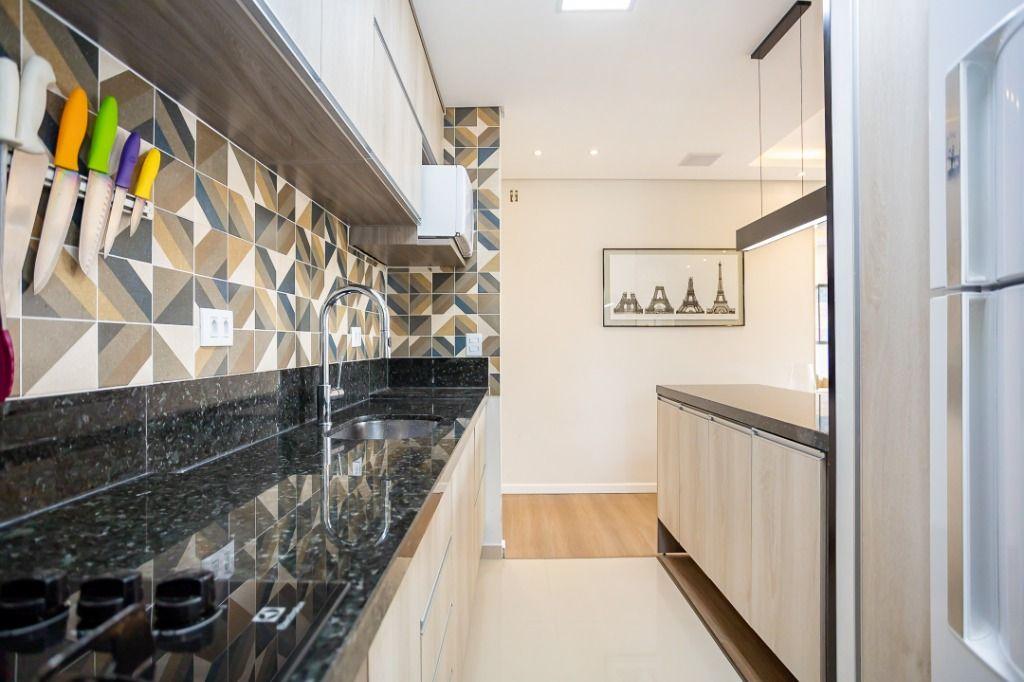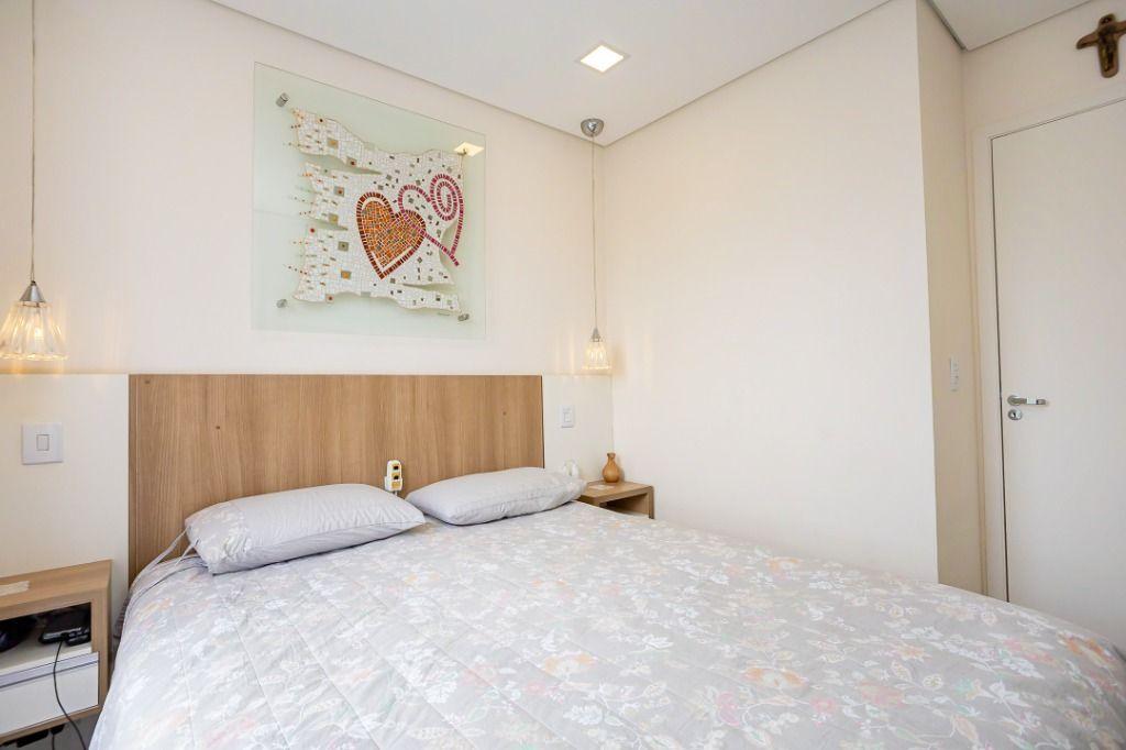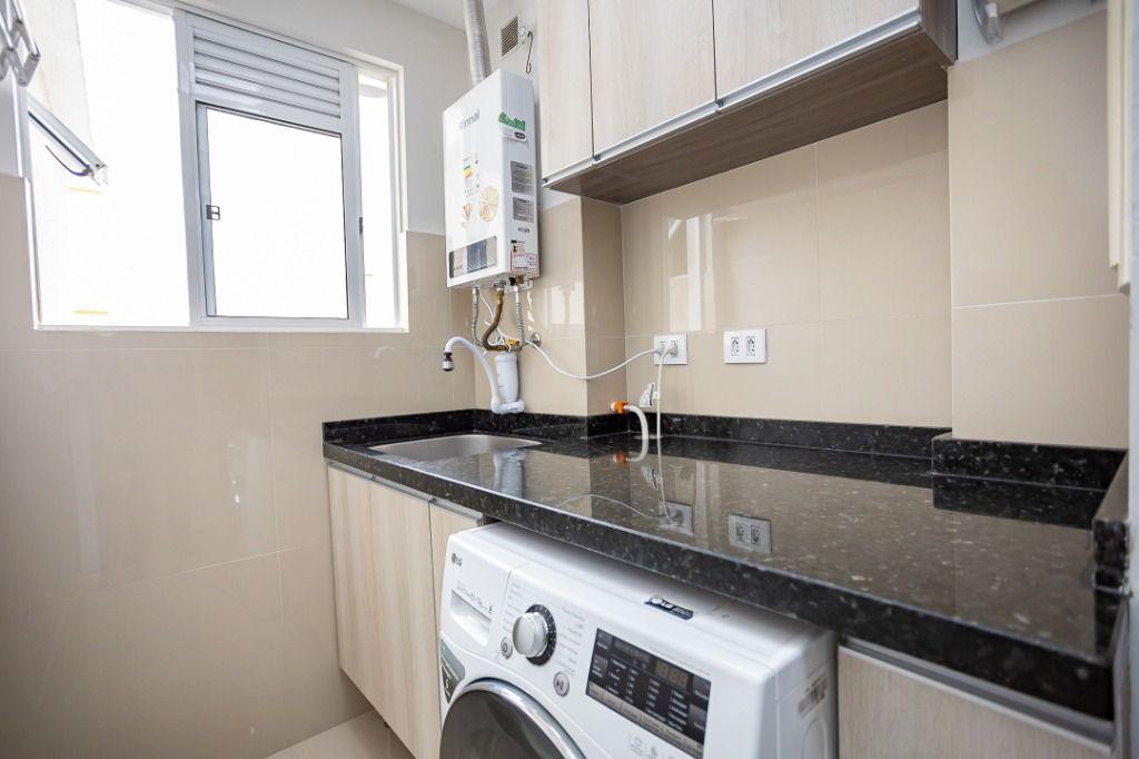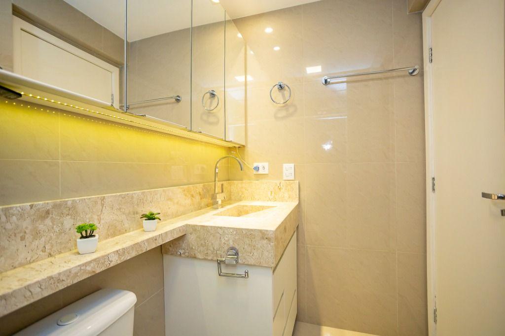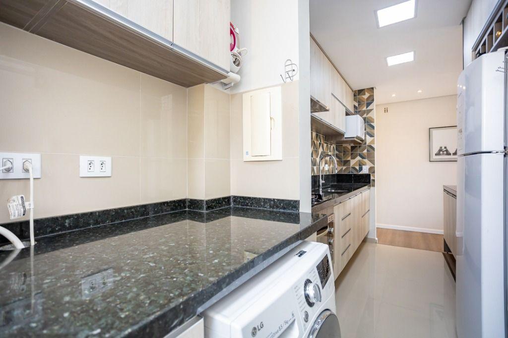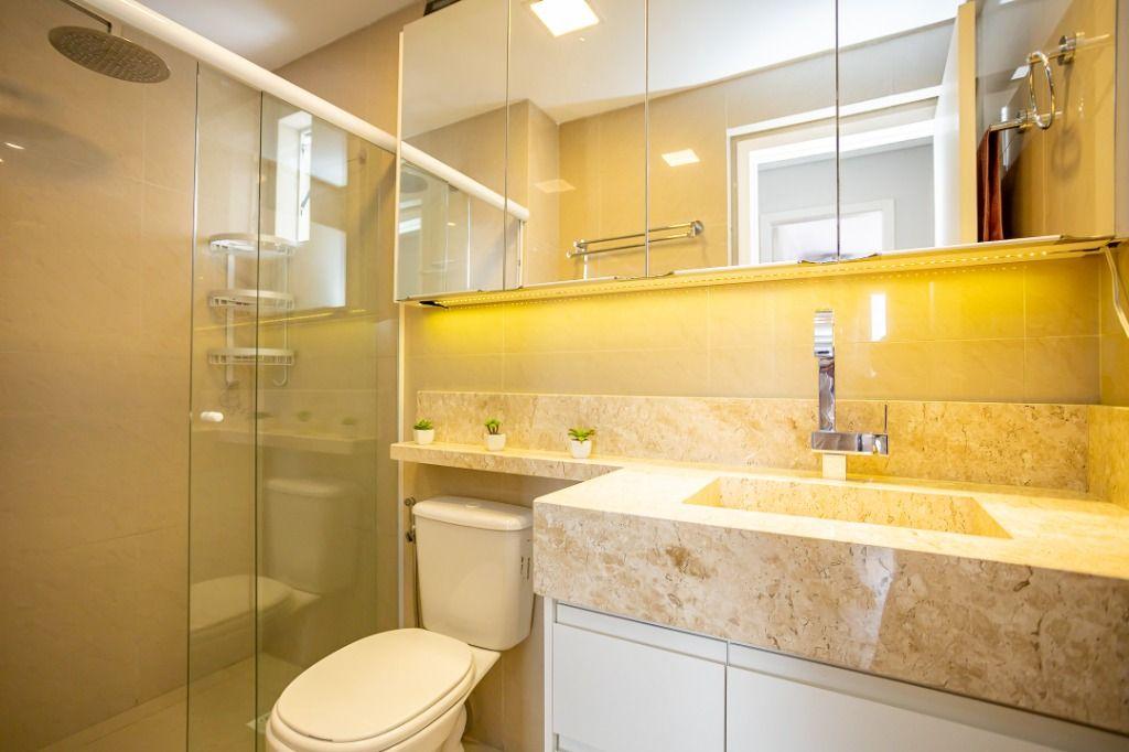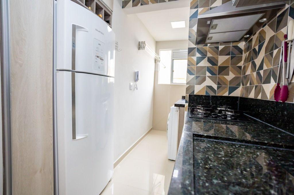 Apartamento com 60m² privativos, distribuídos em 3 quartos todos com armários planejados, sendo um transformado em closet, 2 deles possuem cama e televisão. Sala para dois ambientes com mesa de jantar, cervejeira, sofá, rack/painel com televisão. Cozinha com armários planejados com os principais eletros (geladeira, forno, cooktop, microondas). A área de serviço integrada com a cozinha possui máquina de lavar roupas. Aquecimento de água a gás.
