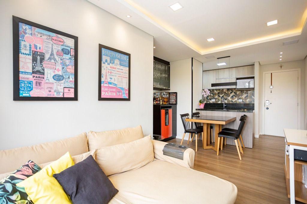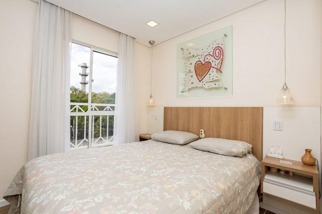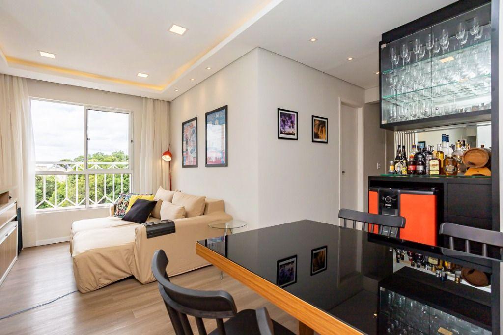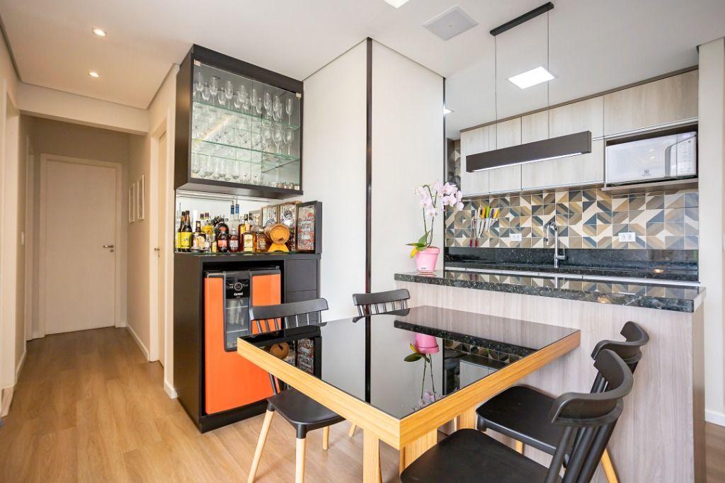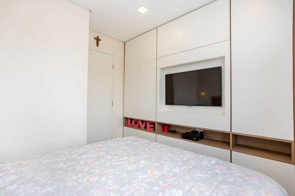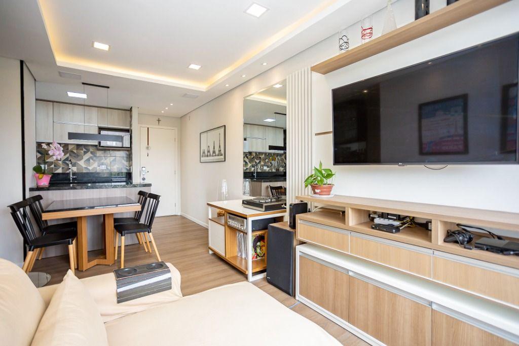 Apartamento com 60m² privativos, distribuídos em 3 quartos todos com armários planejados, sendo um transformado em closet, 2 deles possuem cama e televisão. Sala para dois ambientes com mesa de jantar, cervejeira, sofá, rack/painel com televisão. Cozinha com armários planejados com os principais eletros (geladeira, forno, cooktop, microondas). A área de serviço integrada com a cozinha possui máquina de lavar roupas. Aquecimento de água a gás.