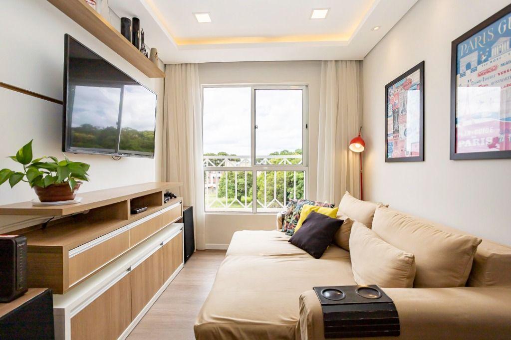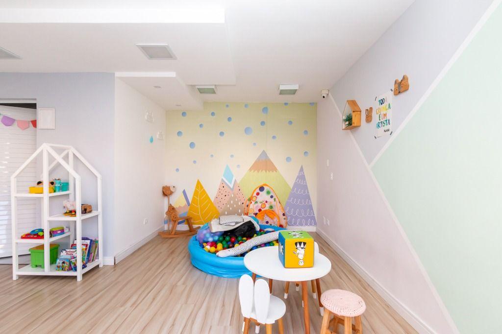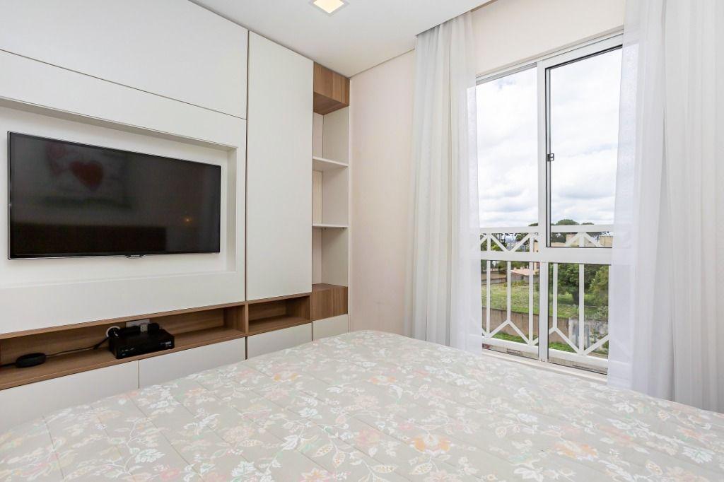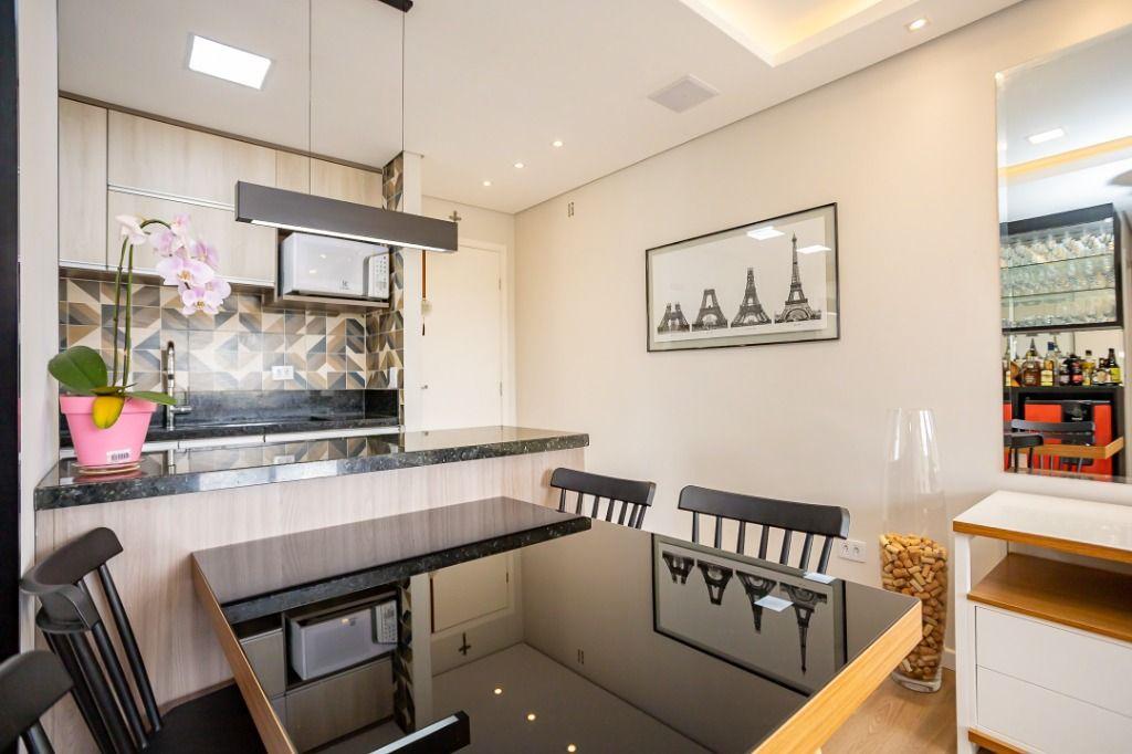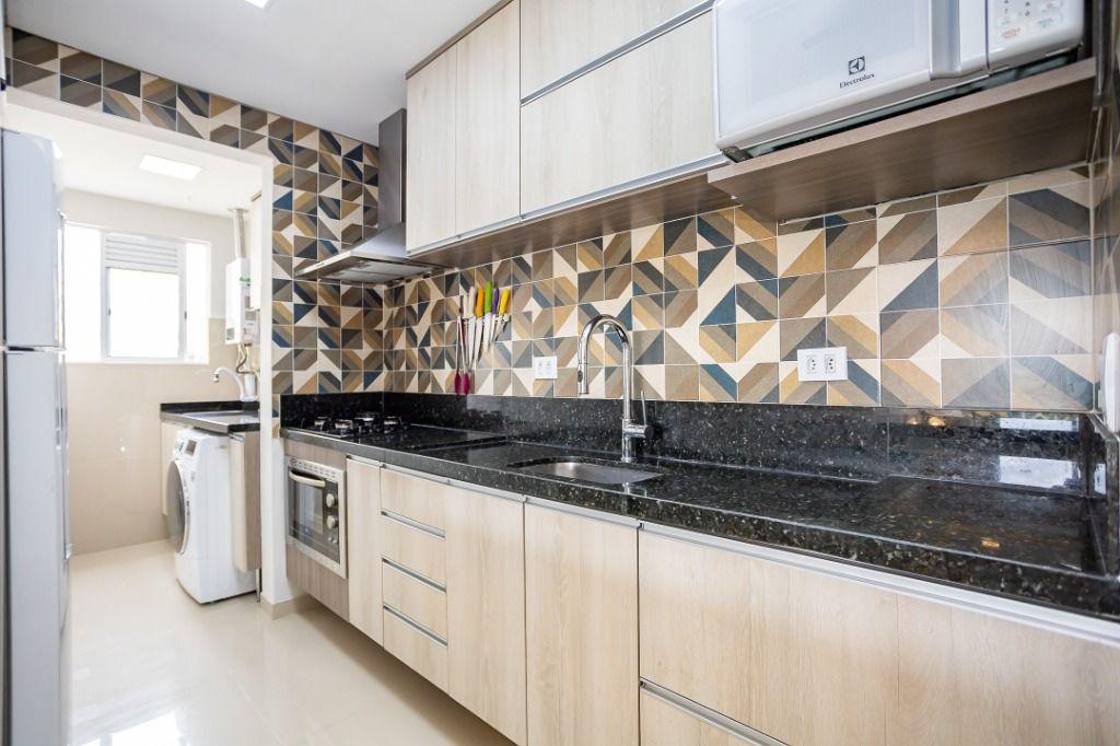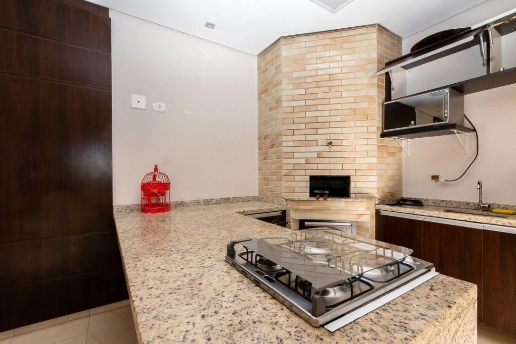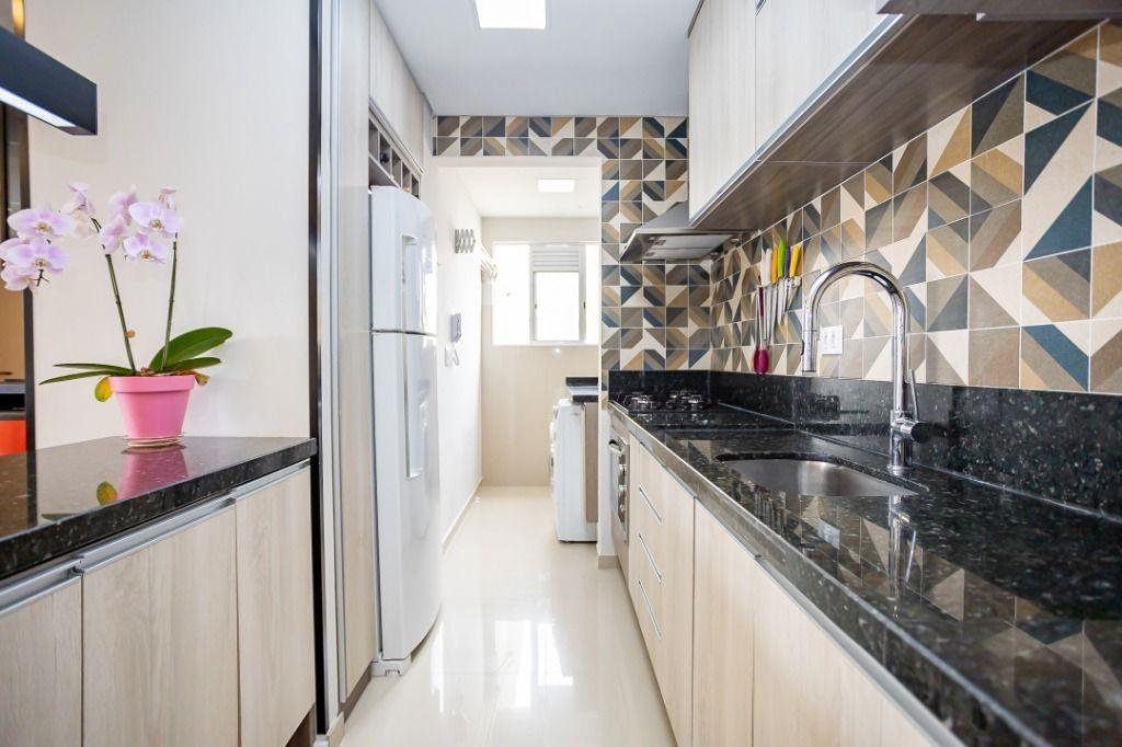 Apartamento com 60m² privativos, distribuídos em 3 quartos todos com armários planejados, sendo um transformado em closet, 2 deles possuem cama e televisão. Sala para dois ambientes com mesa de jantar, cervejeira, sofá, rack/painel com televisão. Cozinha com armários planejados com os principais eletros (geladeira, forno, cooktop, microondas). A área de serviço integrada com a cozinha possui máquina de lavar roupas. Aquecimento de água a gás.