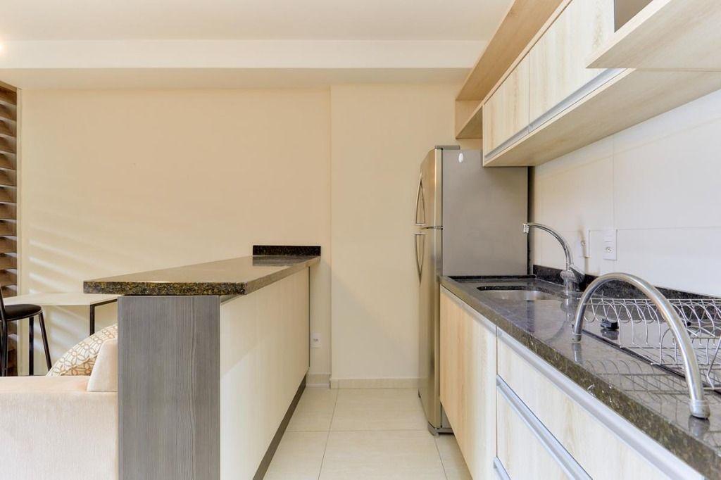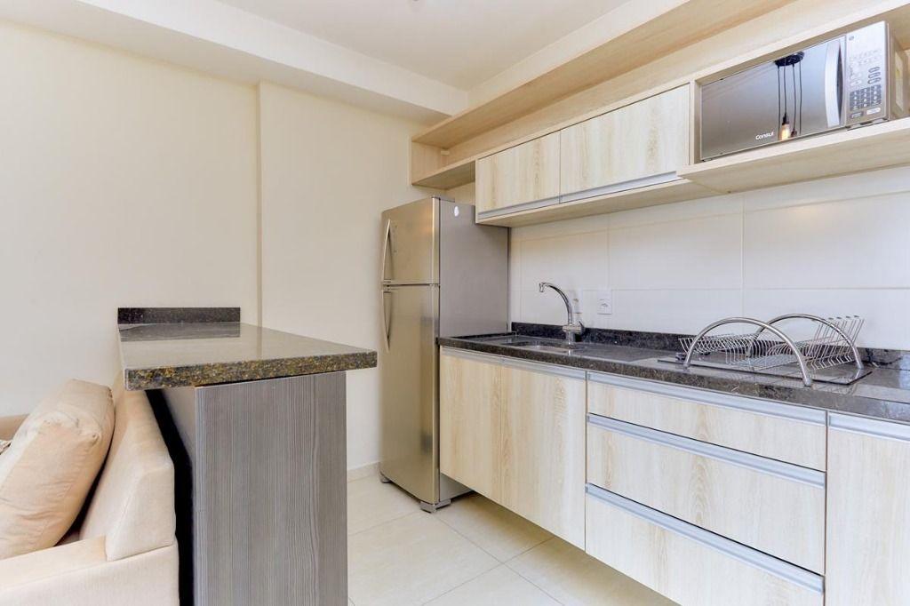 Mobílias: Cozinha c/ armários planejados, cooktop, microondas, geladeira, balcão e cadeira. (contém talheres, louças)