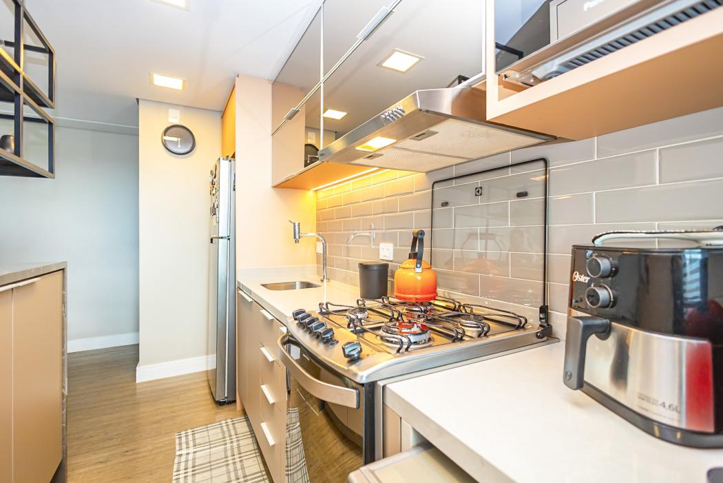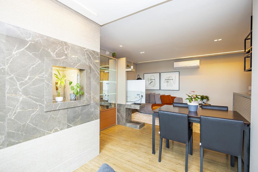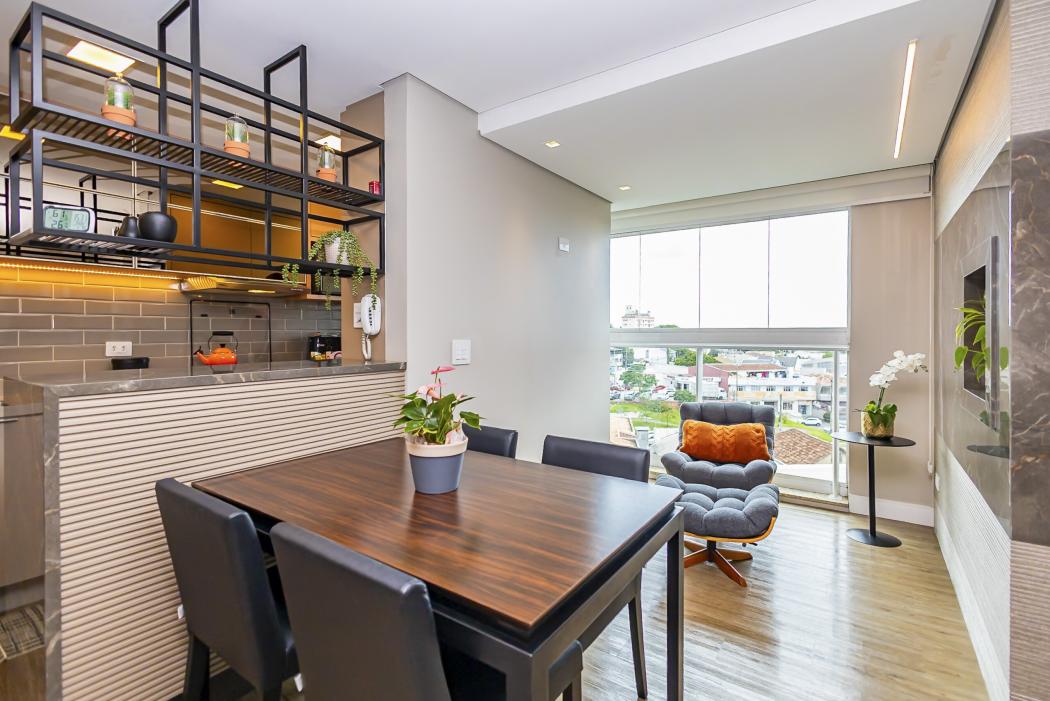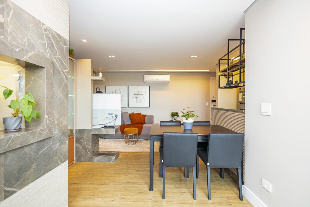 A cozinha funcional conectada ao living, cria um ambiente acolhedor. O destaque fica para a lareira ecológica, que confere um toque extra de elegância à sala. A sacada, agora integrada, amplia a área social, garantindo conforto e luminosidade, complementada por uma churrasqueira a carvão.