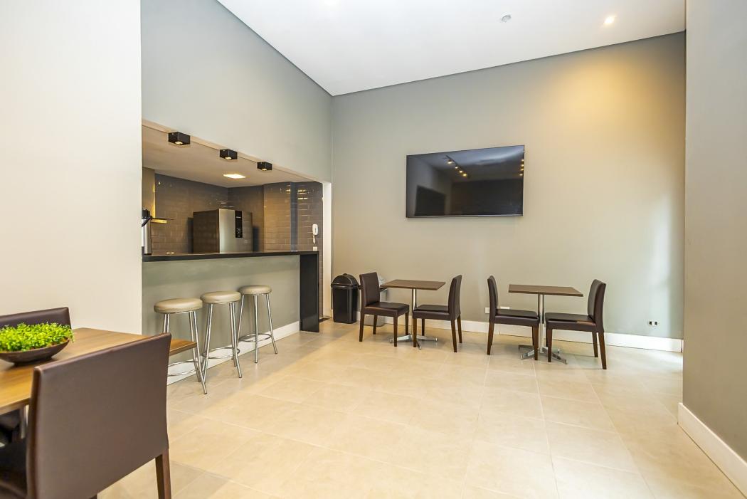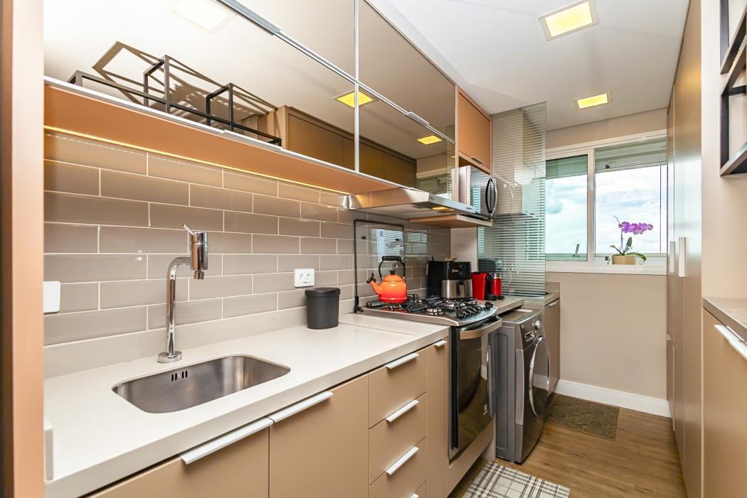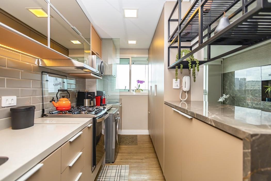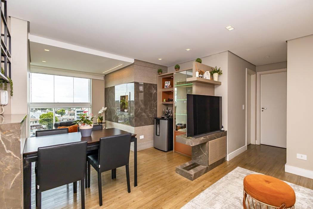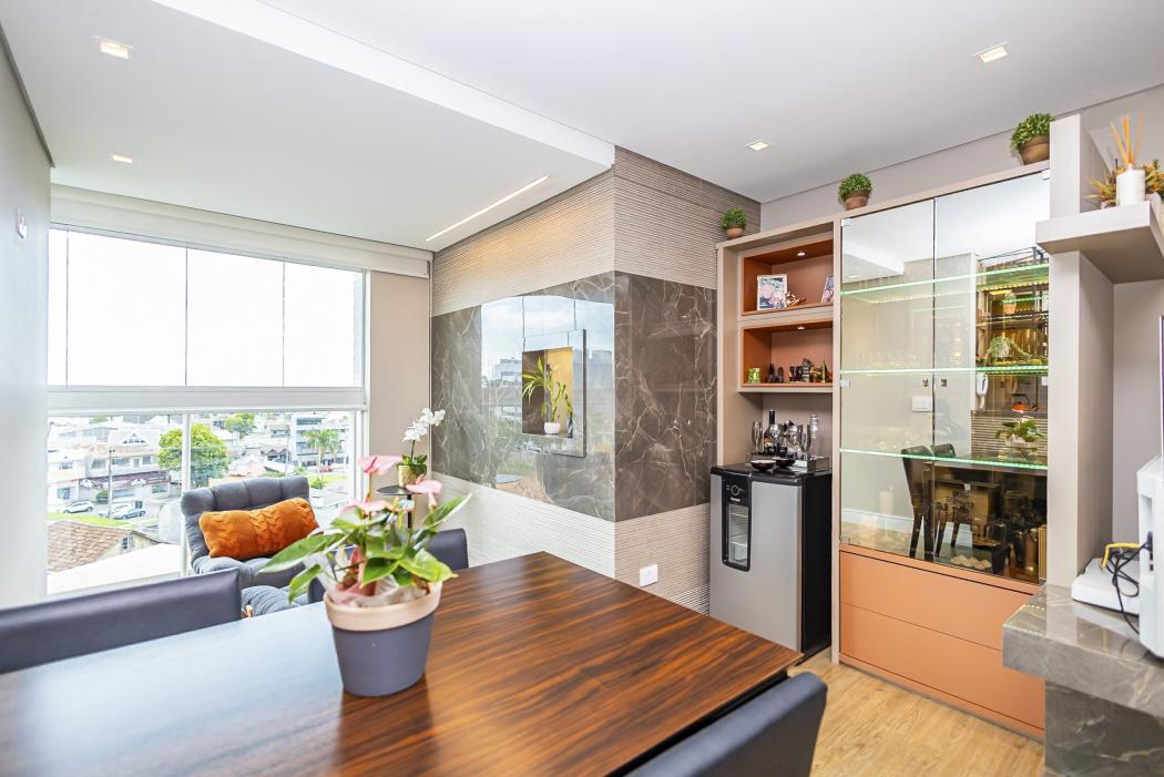 A cozinha funcional conectada ao living, cria um ambiente acolhedor. O destaque fica para a lareira ecológica, que confere um toque extra de elegância à sala. A sacada, agora integrada, amplia a área social, garantindo conforto e luminosidade, complementada por uma churrasqueira a carvão.