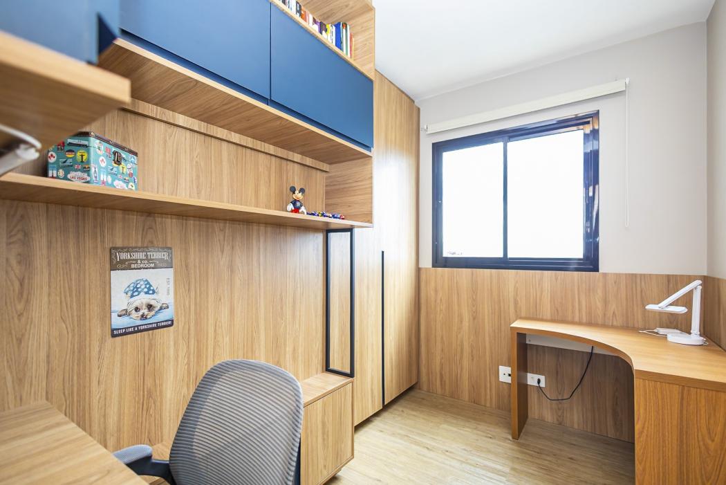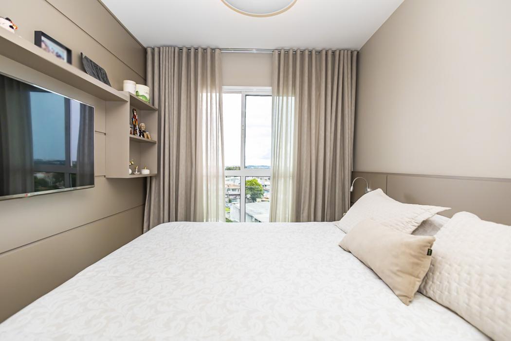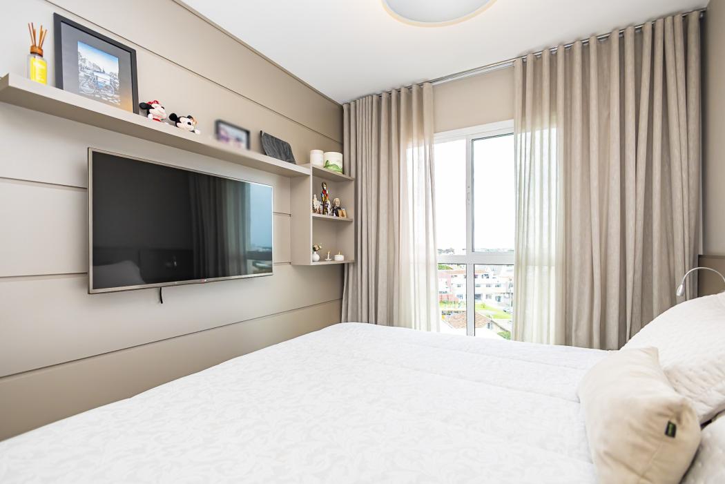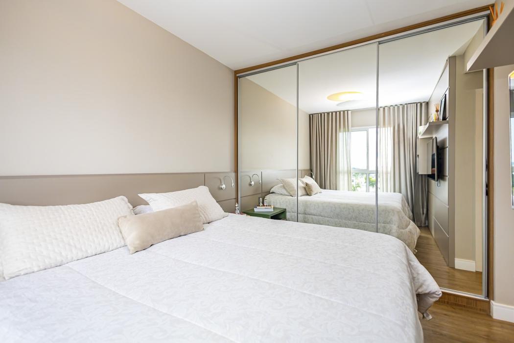 Dormitórios: Suíte equipada com armários planejados em MDF de alta densidade, painel de cabeceira e prateleiras suspensas.