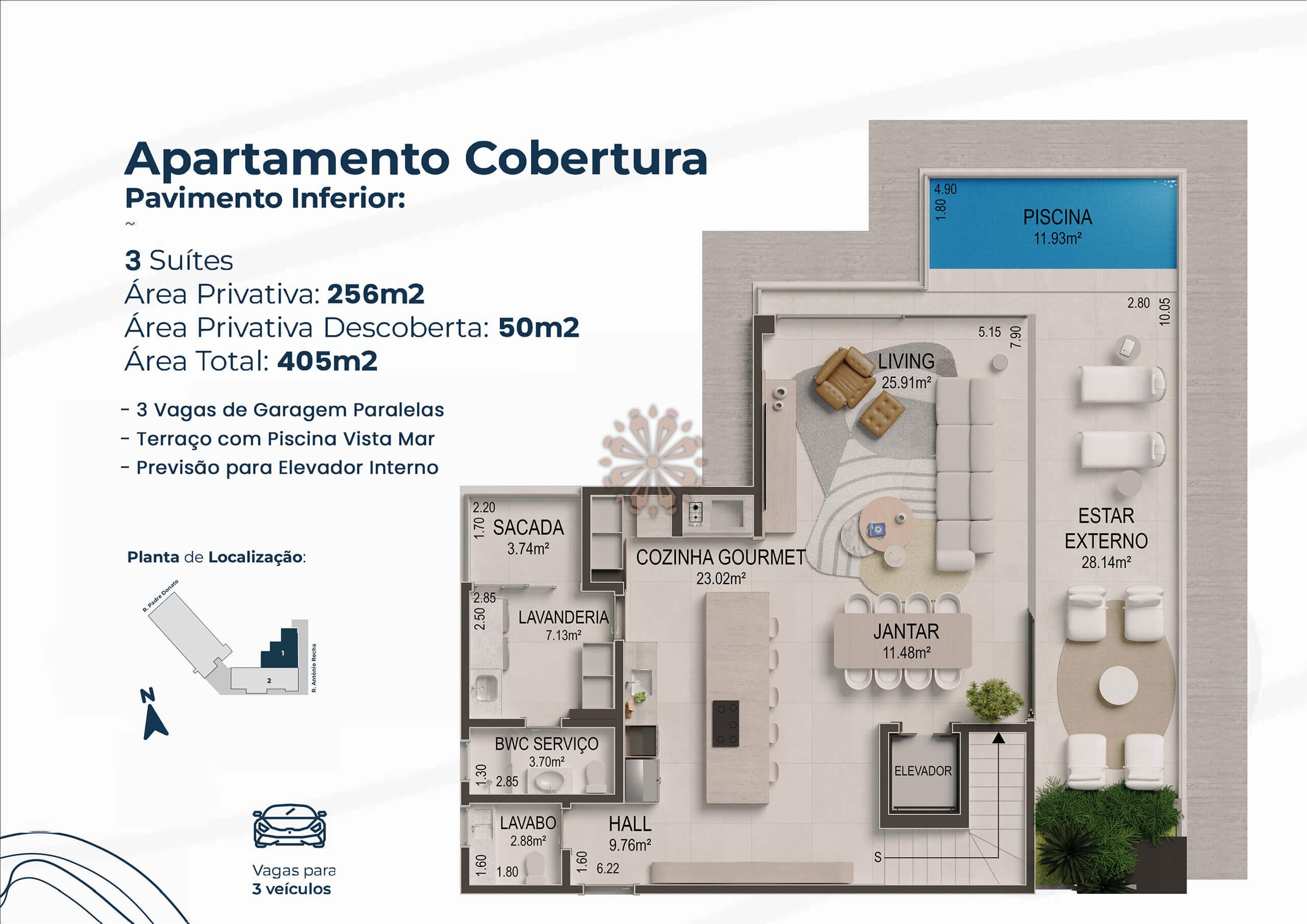 Entre seus diferenciais estão a skypool com borda infinita e deck lounge no 12º pavimento, sky lounge com vista panorâmica para o mar, espaço gourmet e sala de jogos decorados e equipados, fitness center moderno, depósito privativo por unidade, fachada sofisticada com revestimento em porcelanato, infraestrutura para energia solar fotovoltaica nas áreas comuns, elevadores com pé-direito alto, pet place com área de banho, infraestrutura para carregamento de veículos elétricos, manta acústica entre lajes, ducha para banhistas, hall de entrada com pé-direito duplo, paisagismo diferenciado e sistema de segurança com câmeras, sensores e reconhecimento facial.