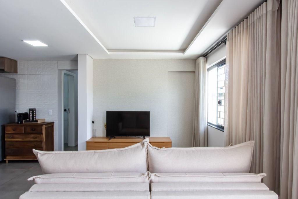 Sala para dois ambientes, com forro rebaixado em gesso, e iluminação de led.