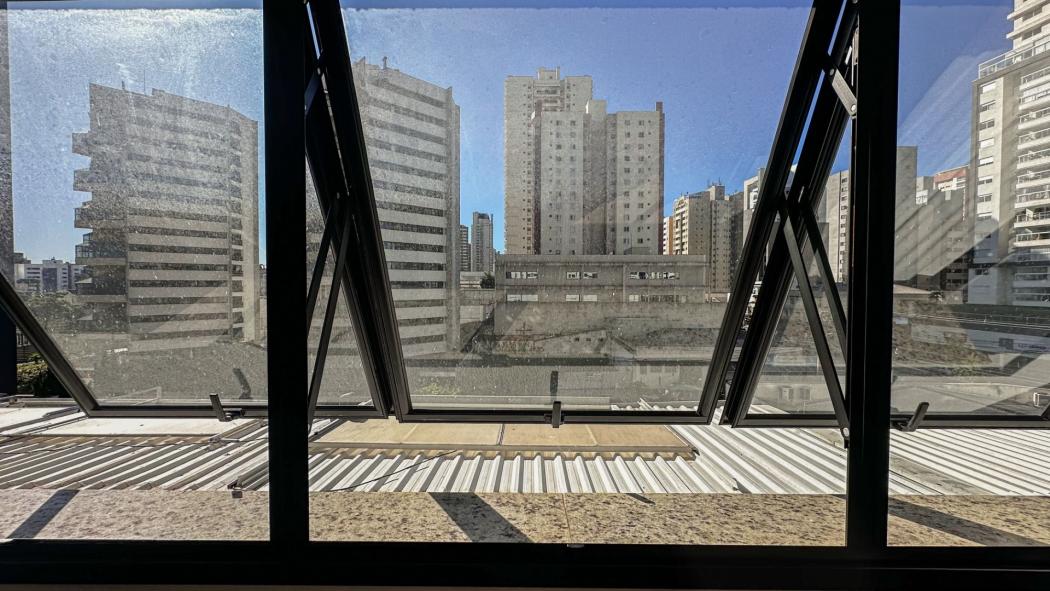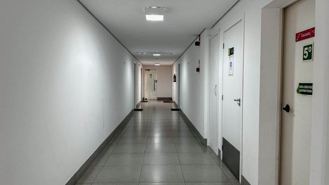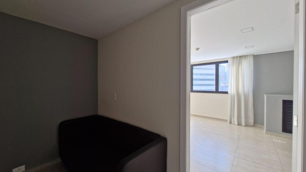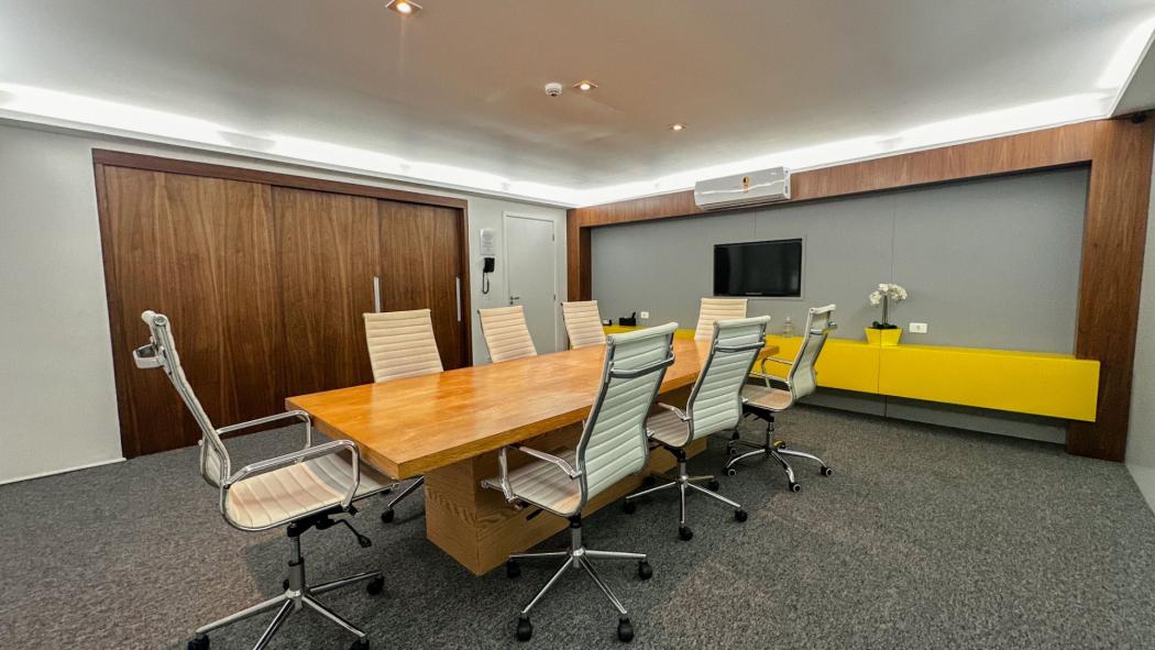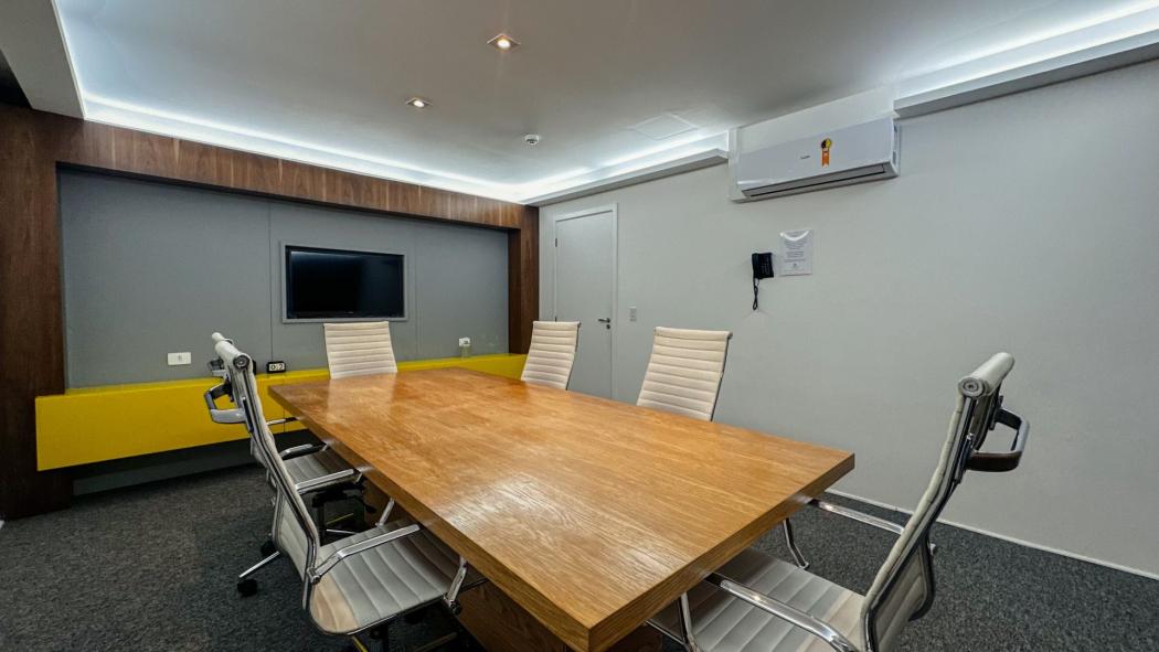 A sala tem 34m² privativos, sendo dividia em 3 ambientes: Sala de Espera, Banheiro e o Espaço Principal com um armário embutido para uso de trabalho e atividade principal do escritório, além de um sofá na área de espera e outros 2 balcões.