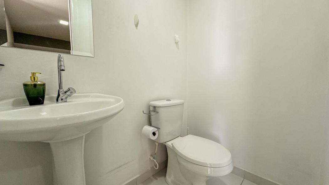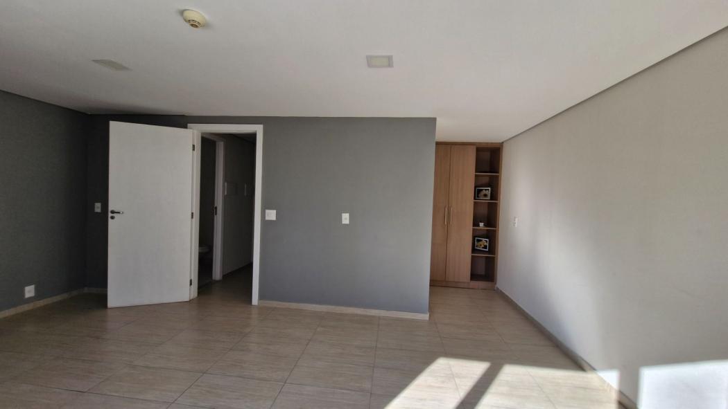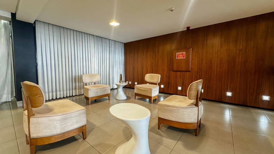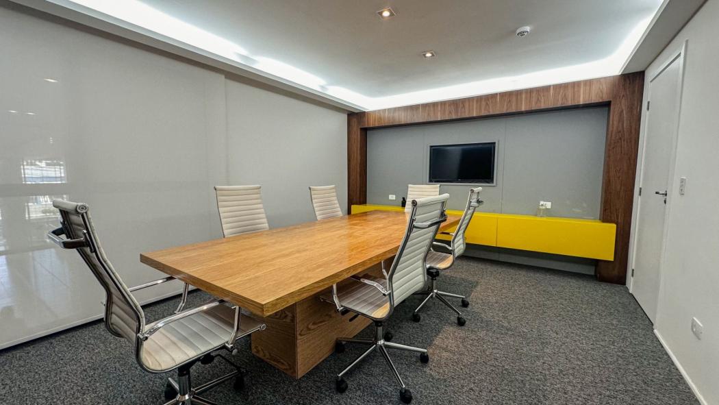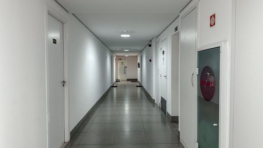 A sala tem 34m² privativos, sendo dividia em 3 ambientes: Sala de Espera, Banheiro e o Espaço Principal com um armário embutido para uso de trabalho e atividade principal do escritório, além de um sofá na área de espera e outros 2 balcões.