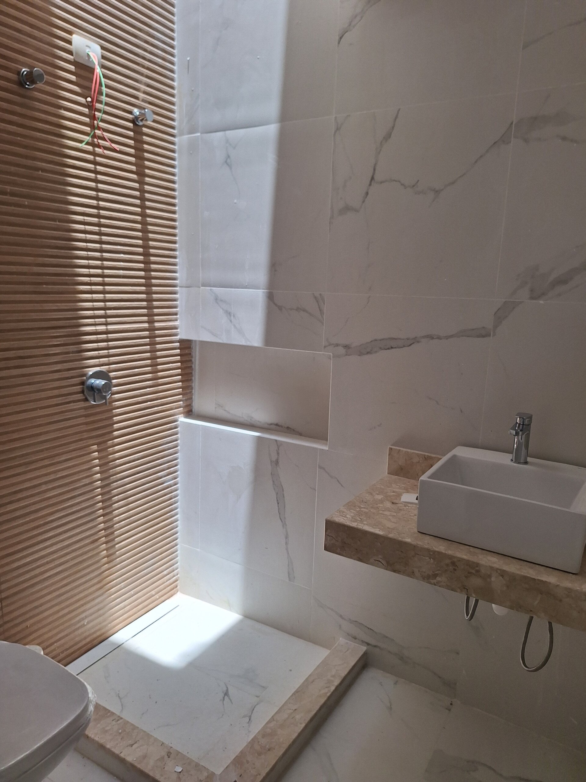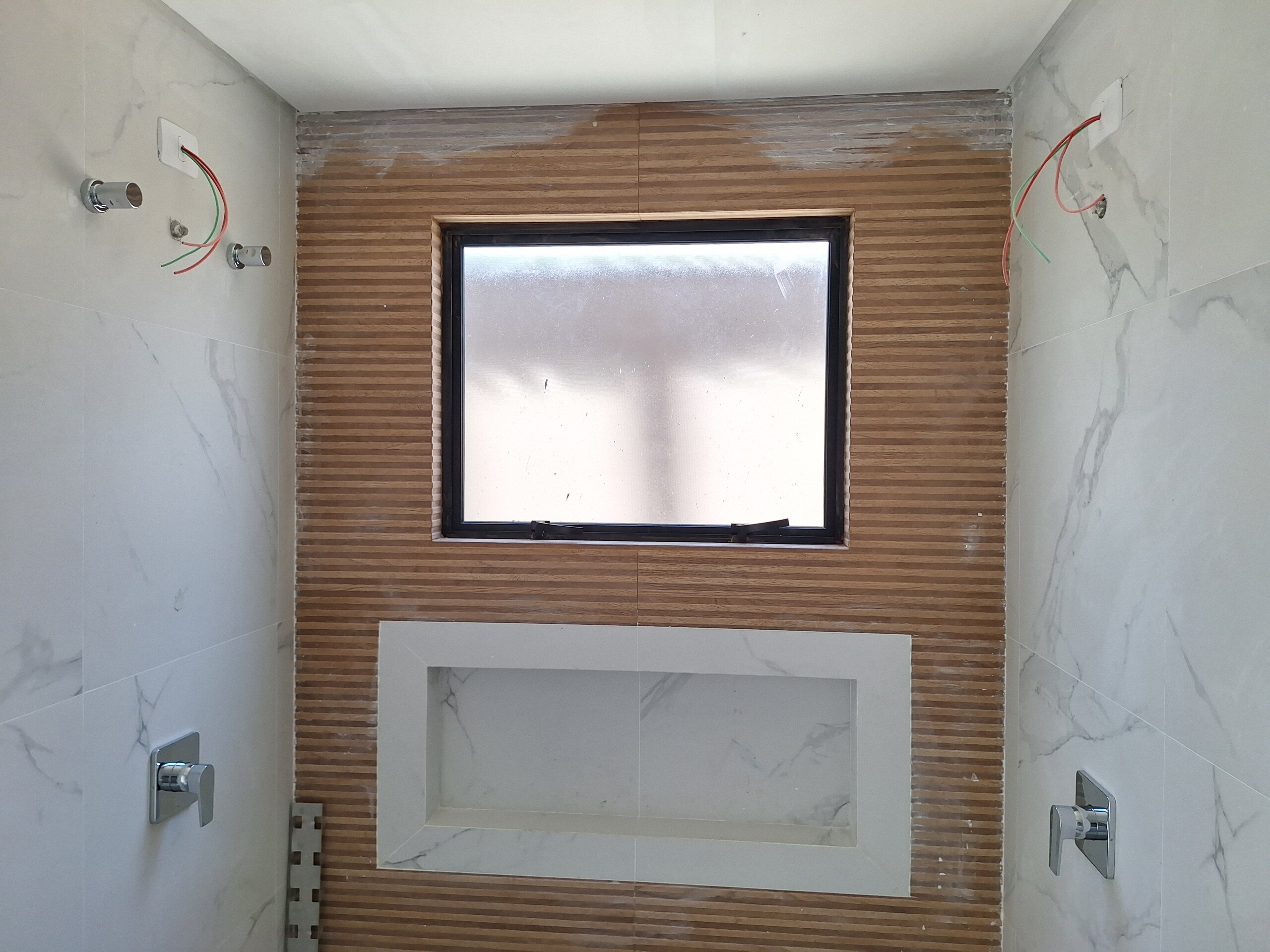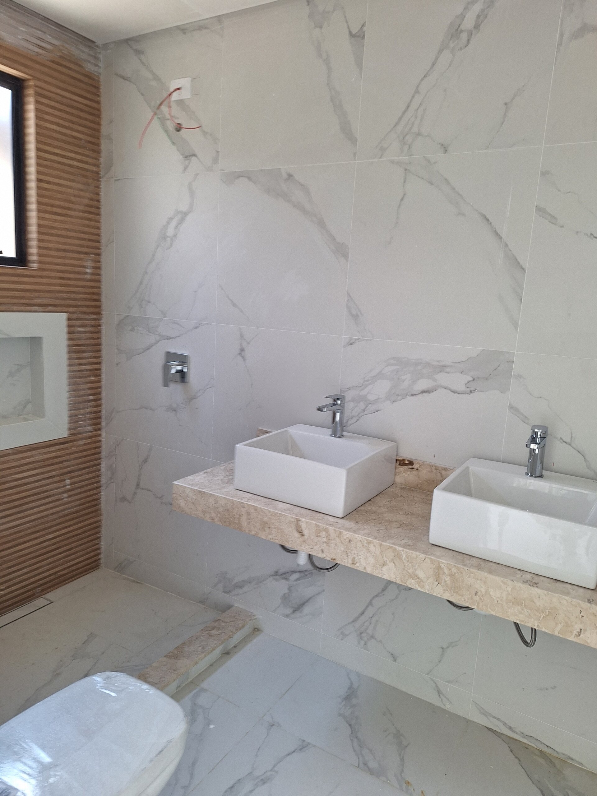 Banheiro master com pia e chuveiros duplos