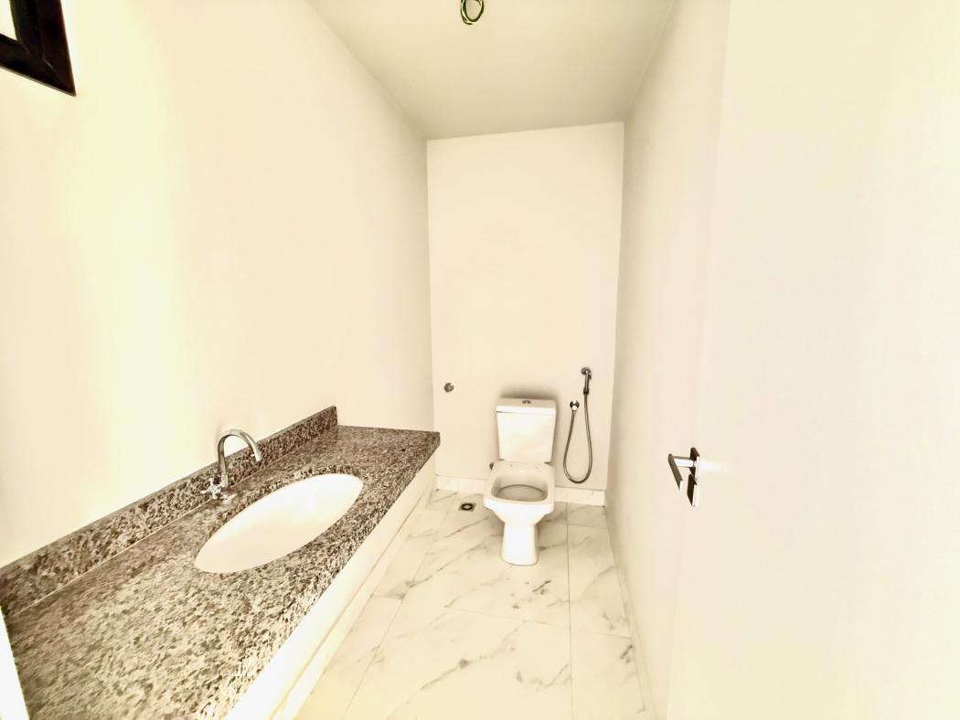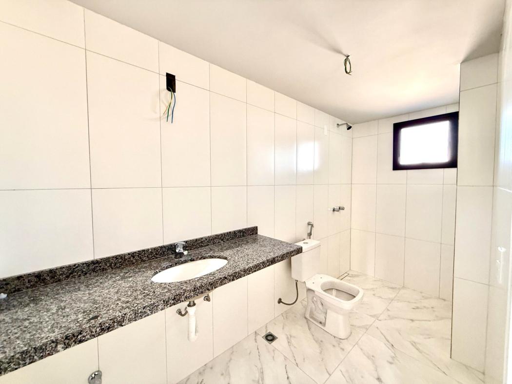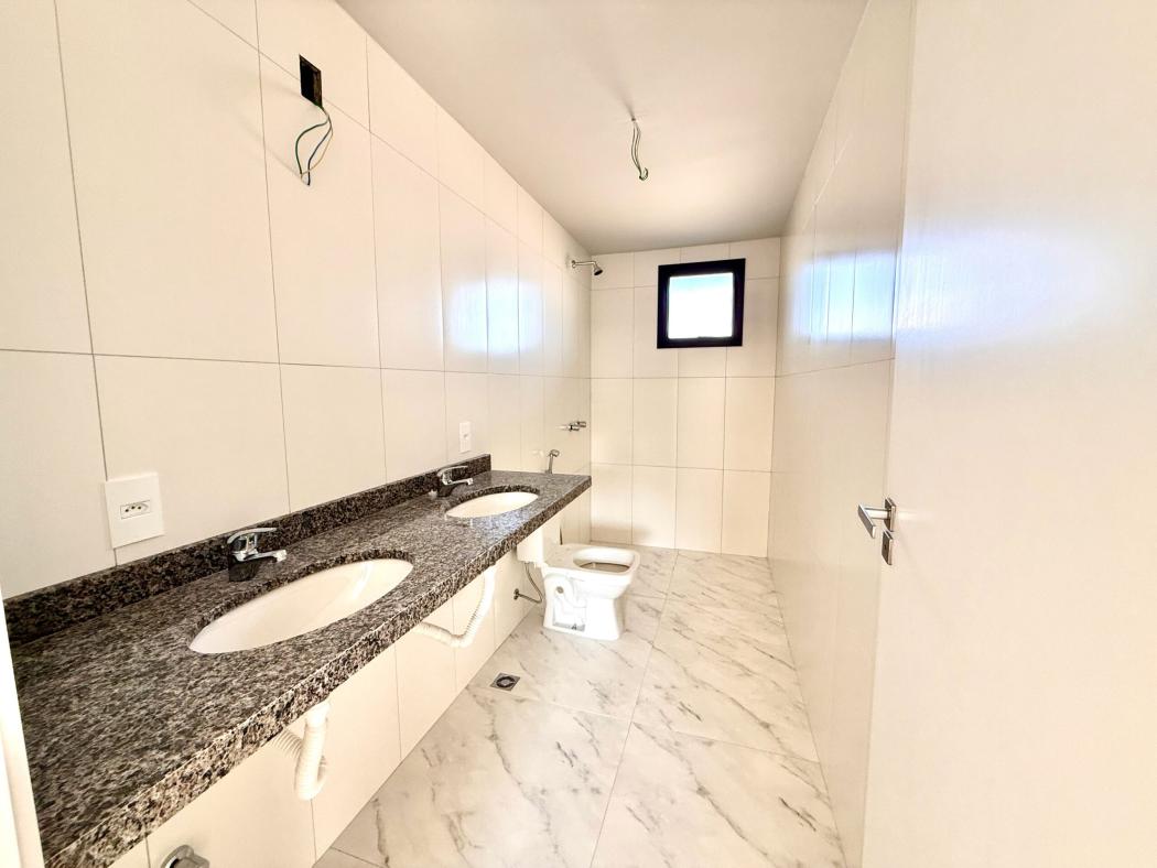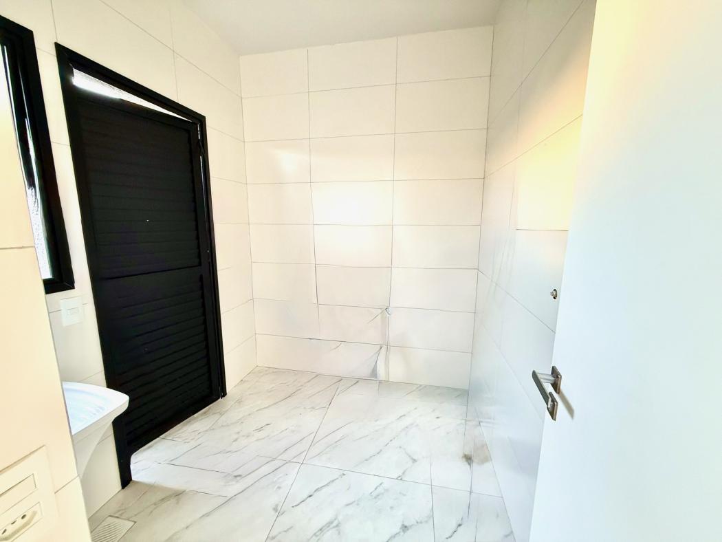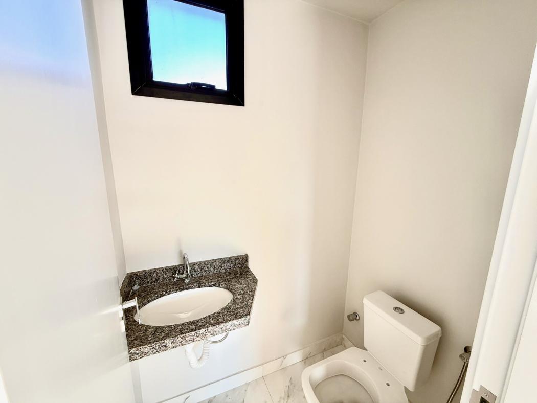 No piso superior, a área íntima oferece equilíbrio entre conforto e privacidade. A suíte master conta com banheiro com duas cubas, reforçando funcionalidade no dia a dia. Dois dormitórios adicionais atendem família, escritório ou quarto de hóspedes, além de sacada técnica que organiza a infraestrutura do imóvel.