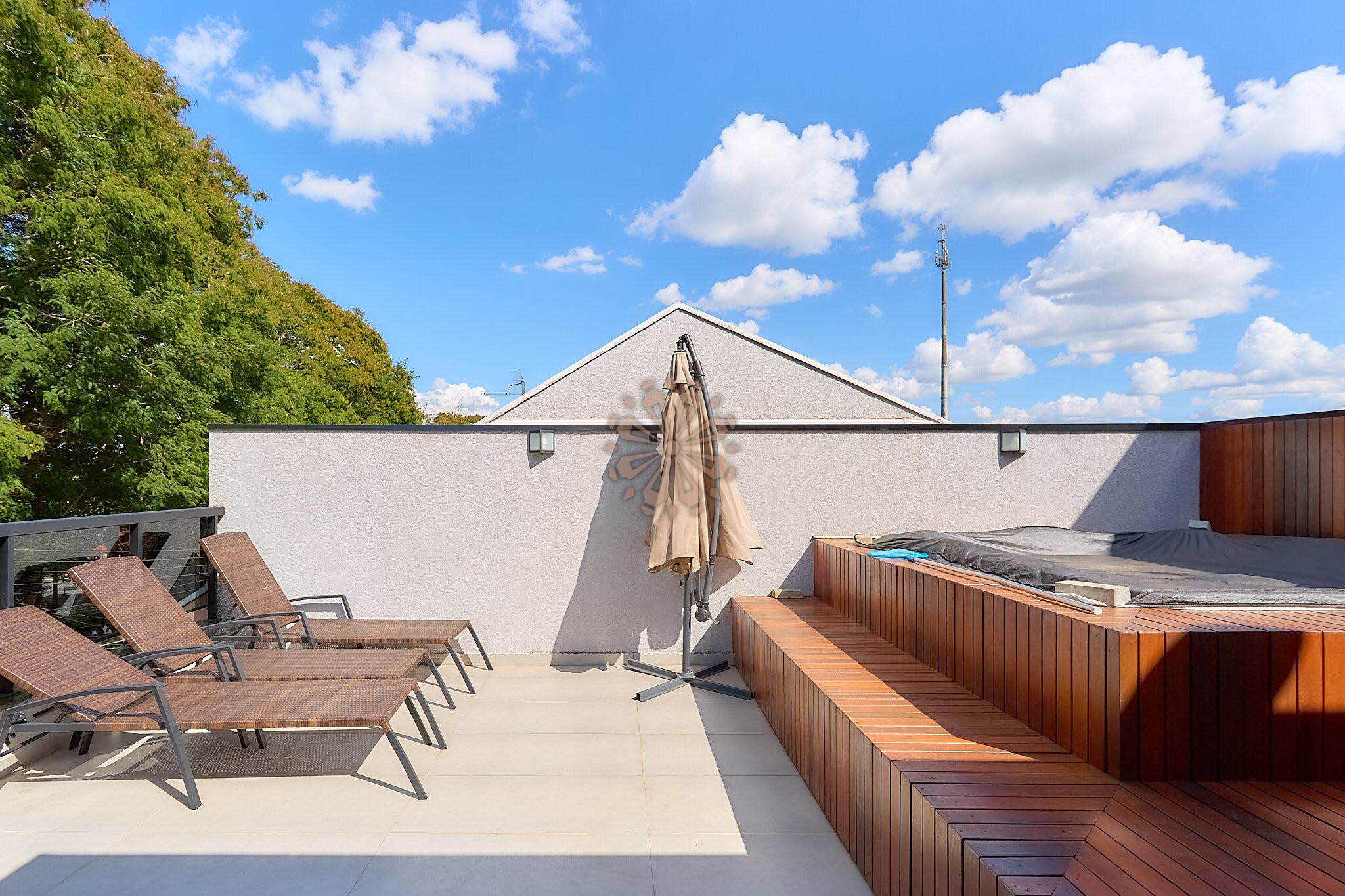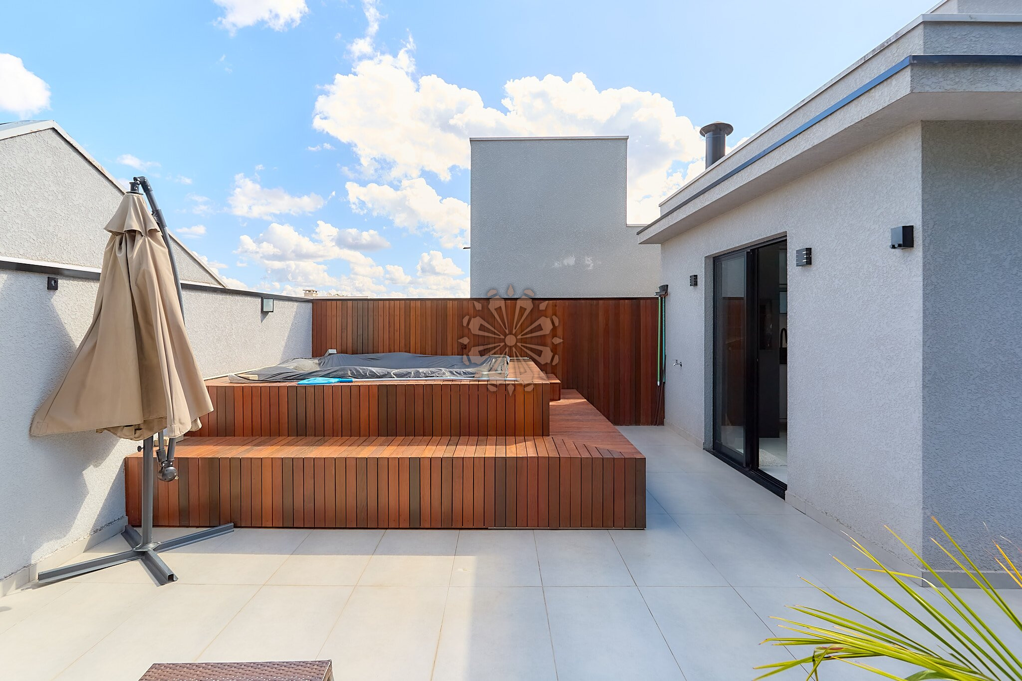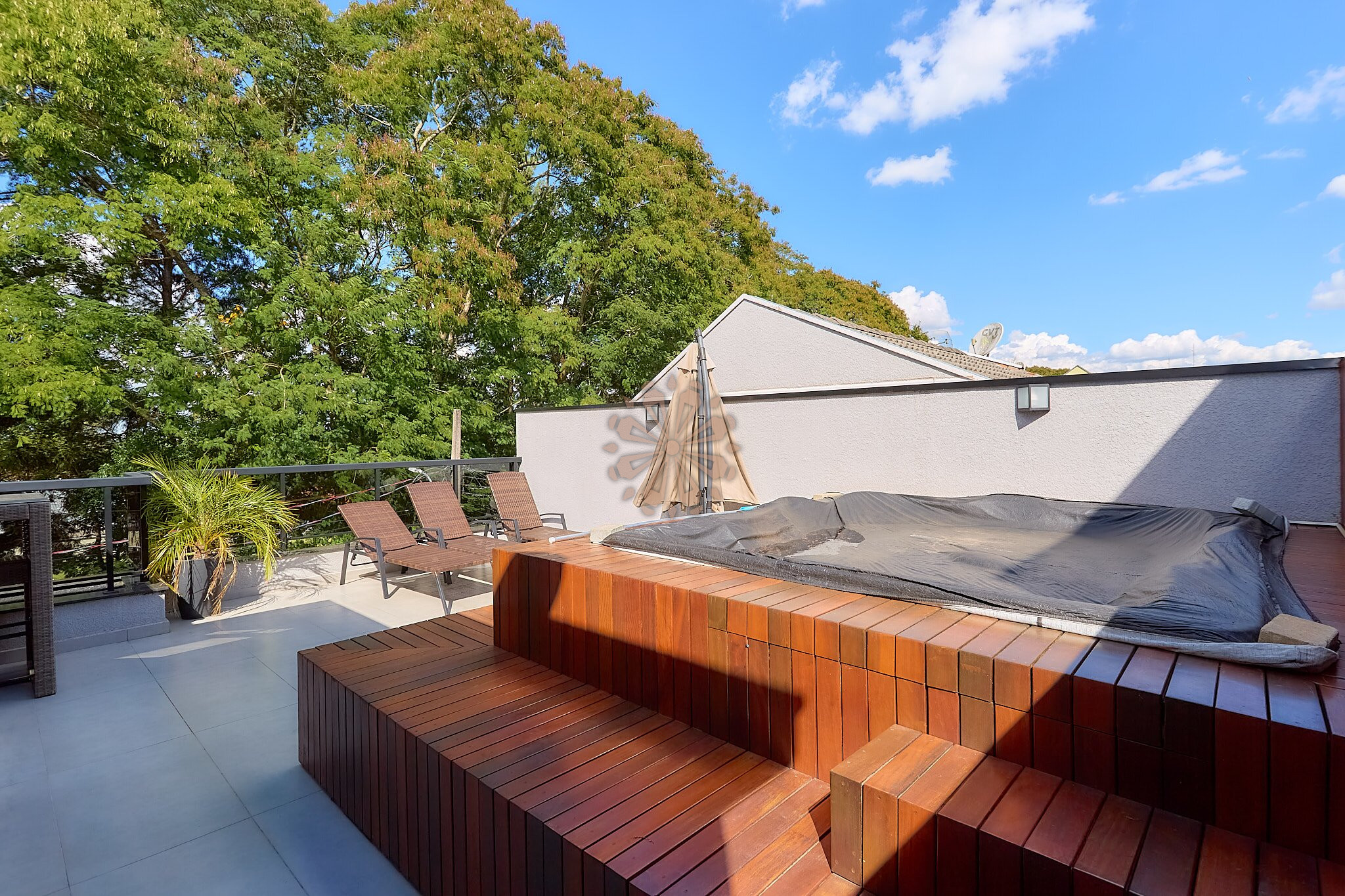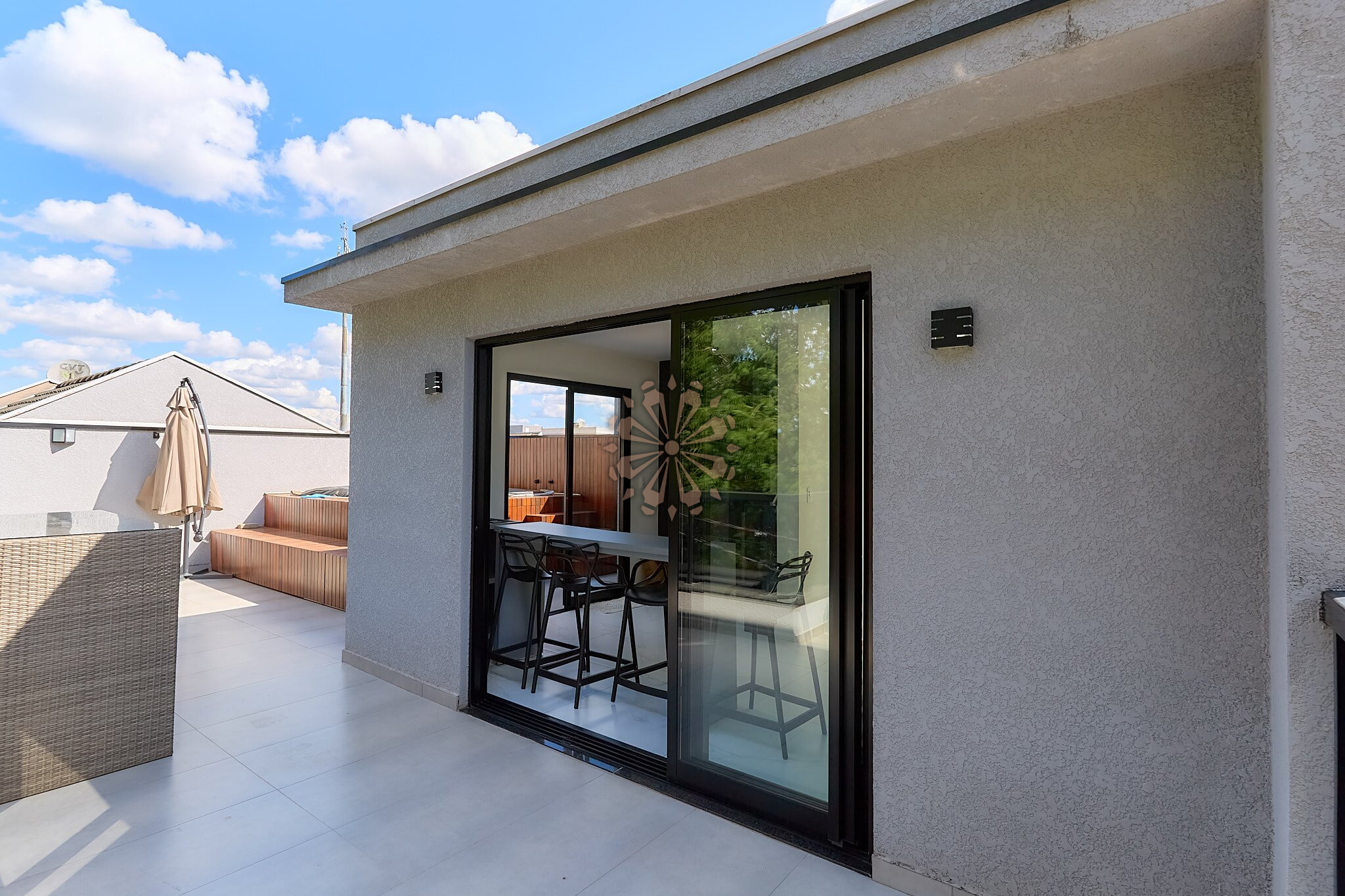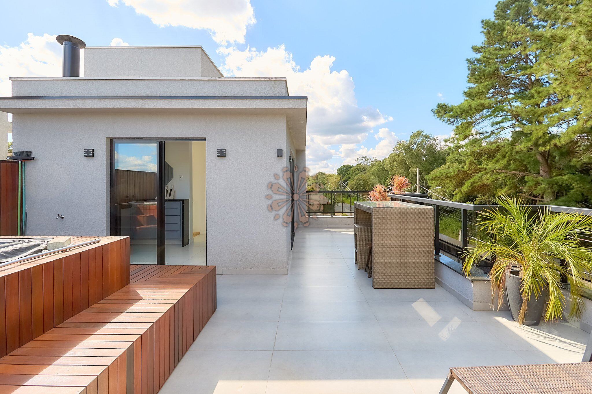 O ático oferece um excelente espaço de lazer, com espaço gourmet, sala de TV, lavabo e um amplo terraço com hidromassagem, ideal para momentos de descanso e convivência, com uma bela vista da região.