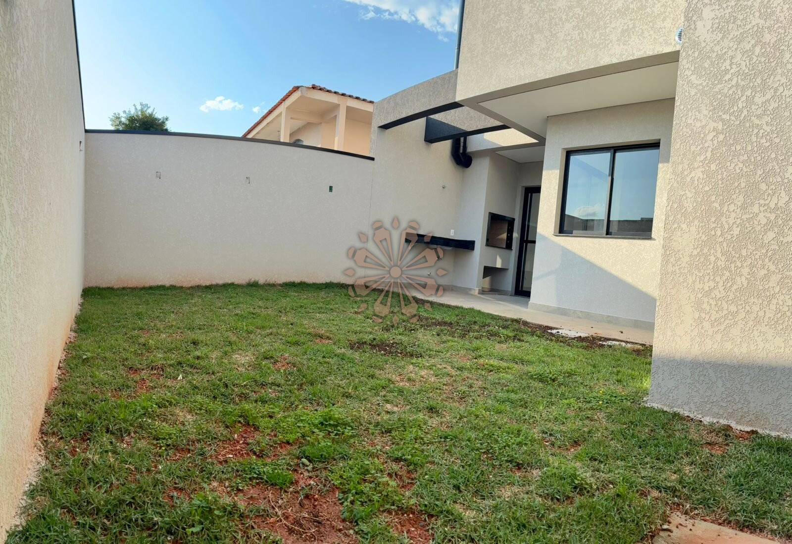 Nos fundos, espaço com churrasqueira e quintal com gramado, perfeito para momentos de lazer ao ar livre.