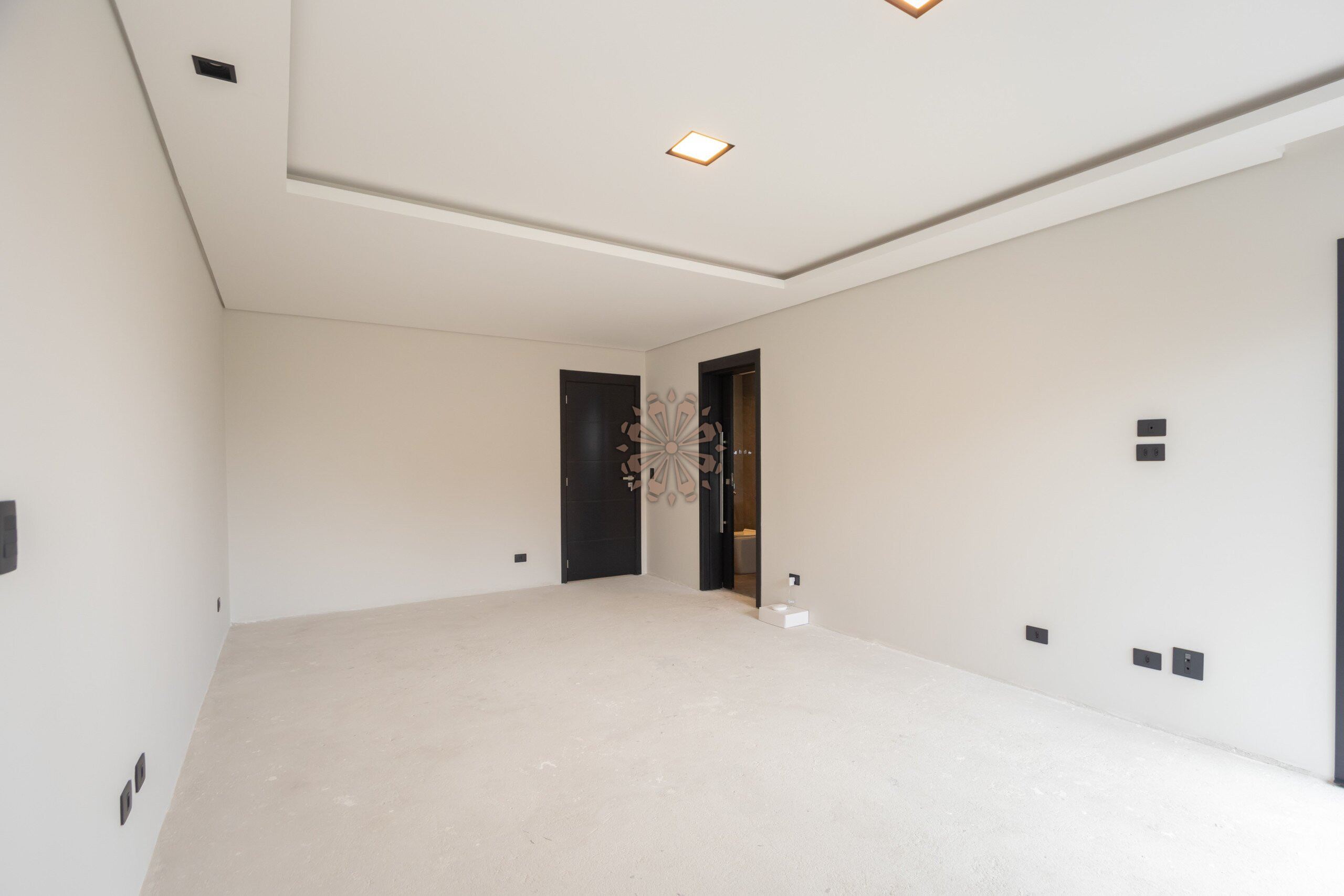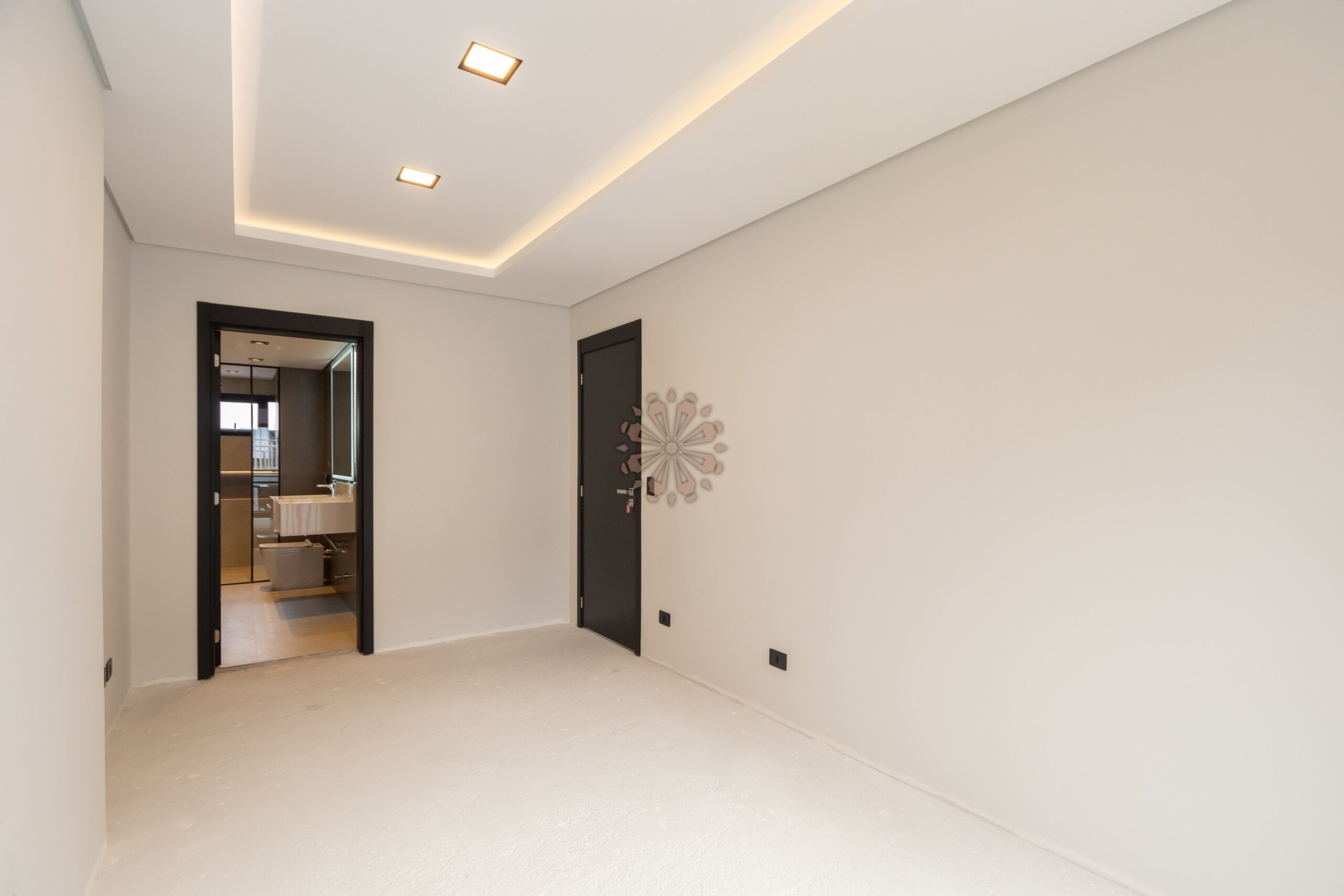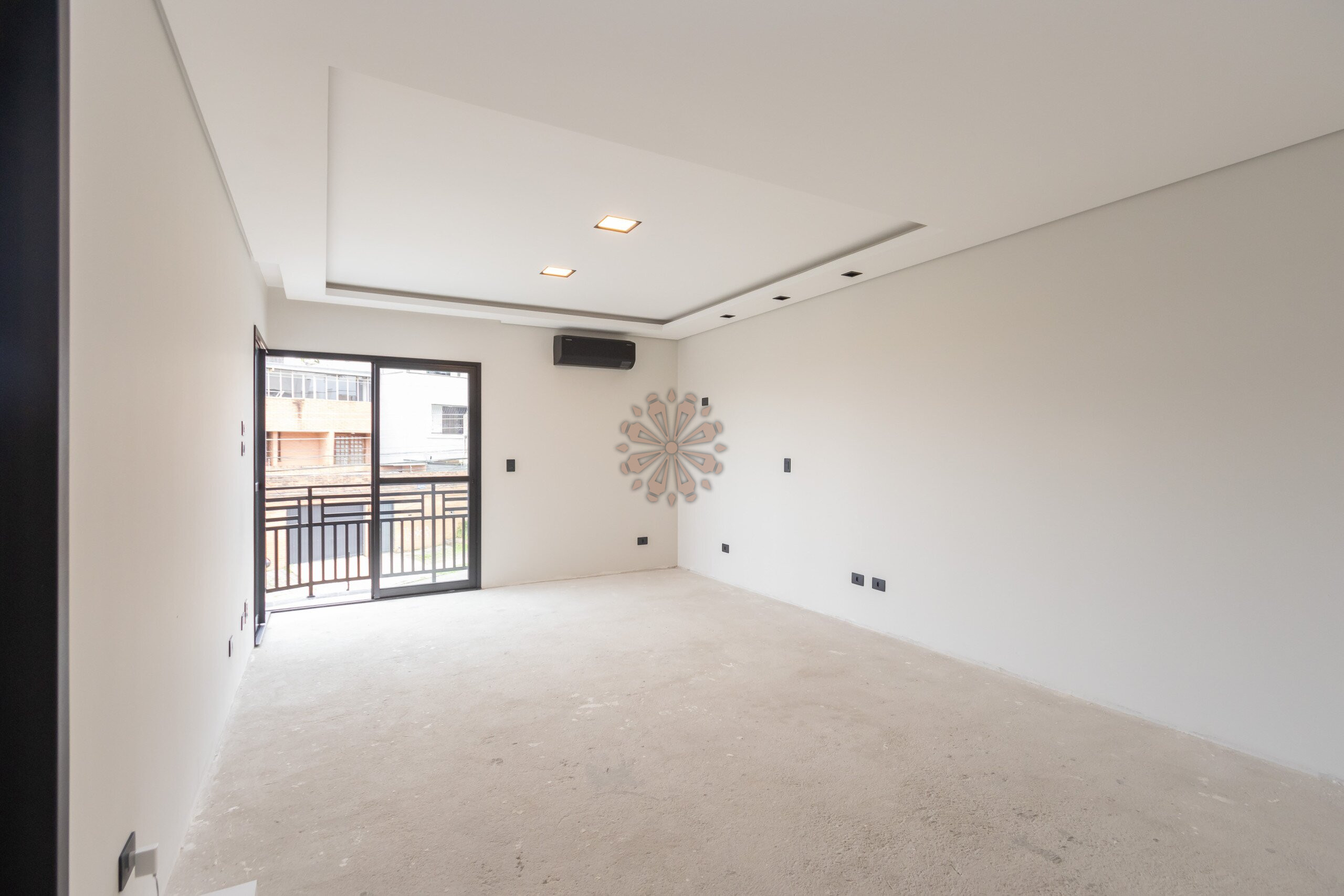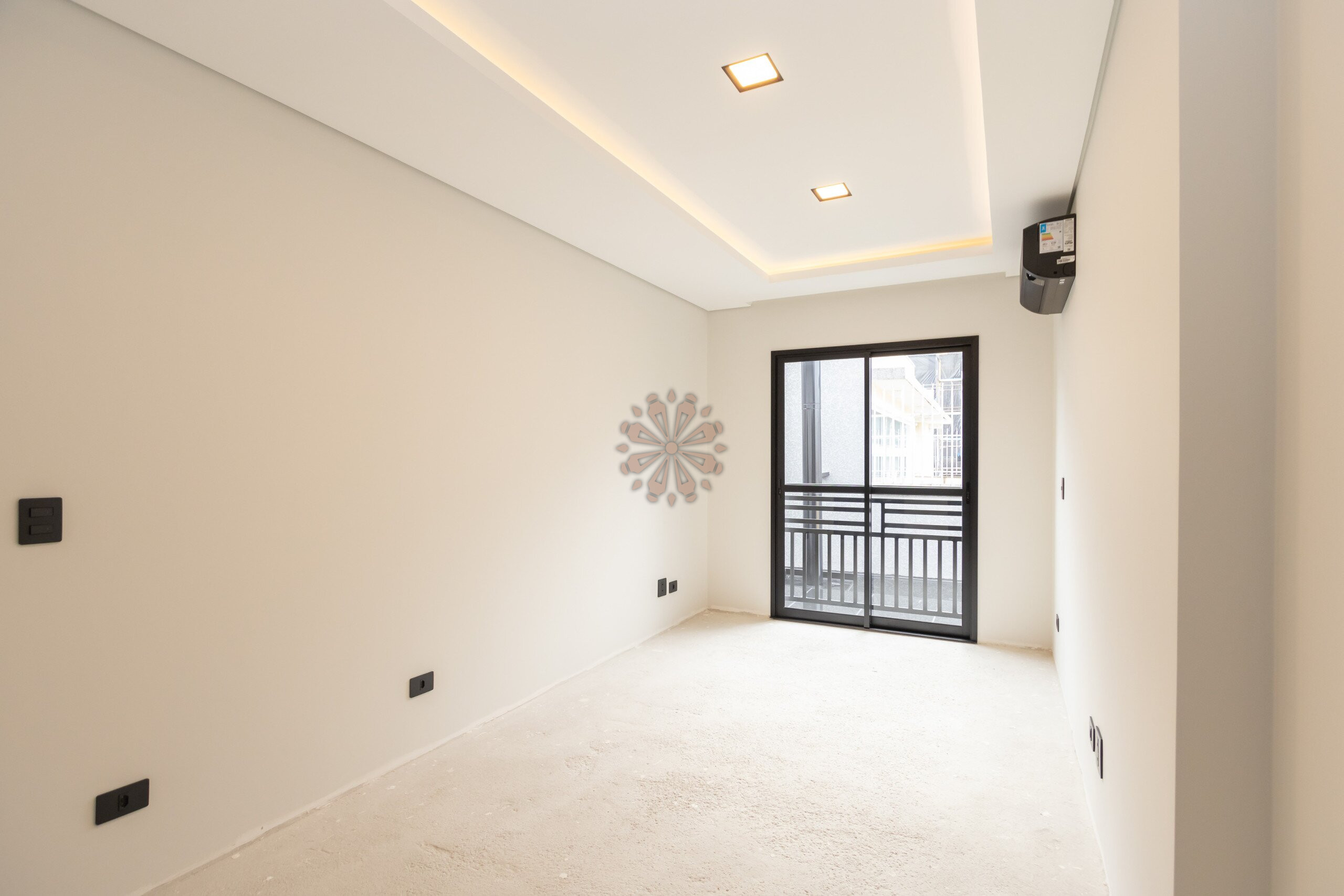 Sala com projeto de iluminação, gesso rebaixado e ar-condicionado em todos os cômodos.