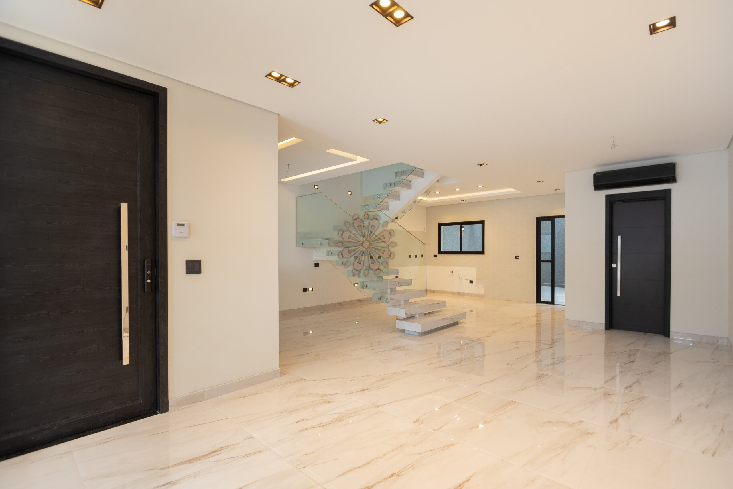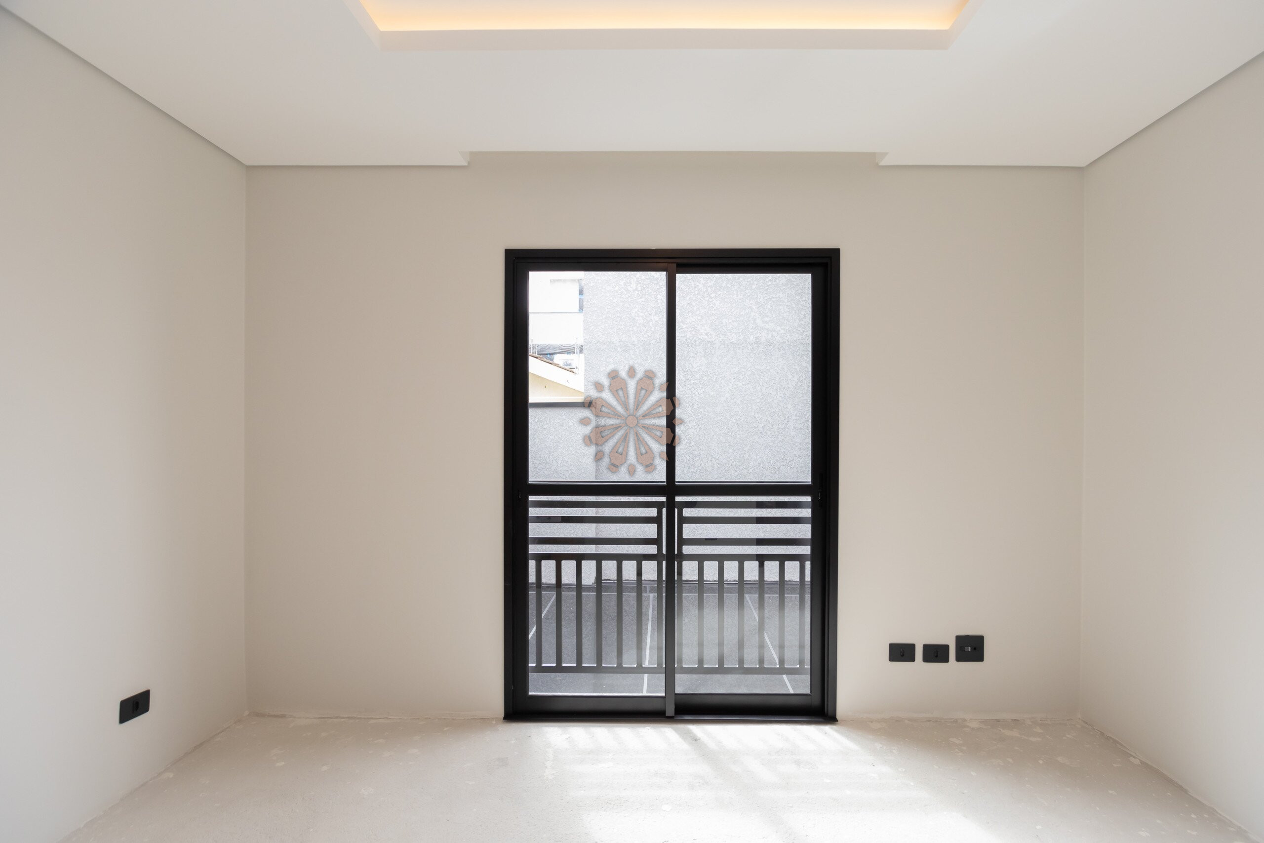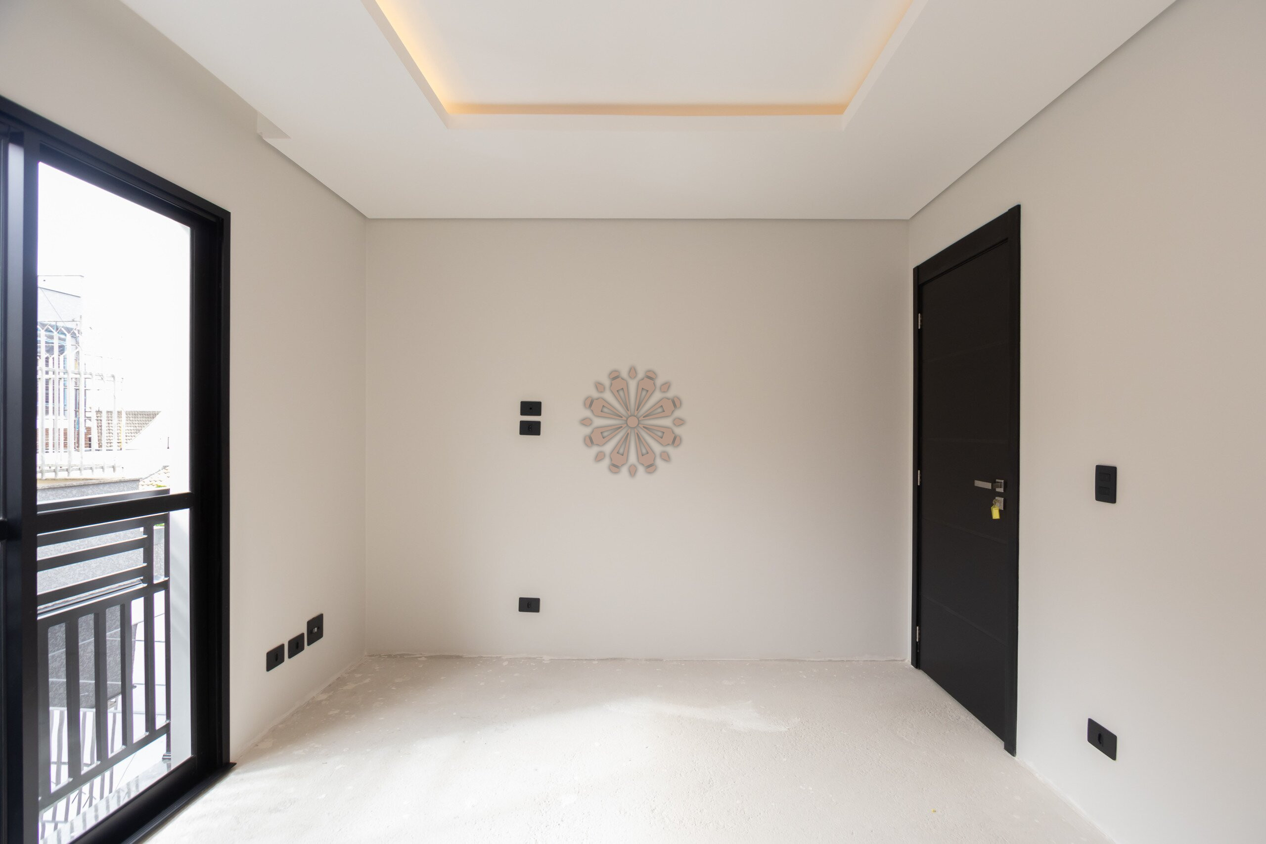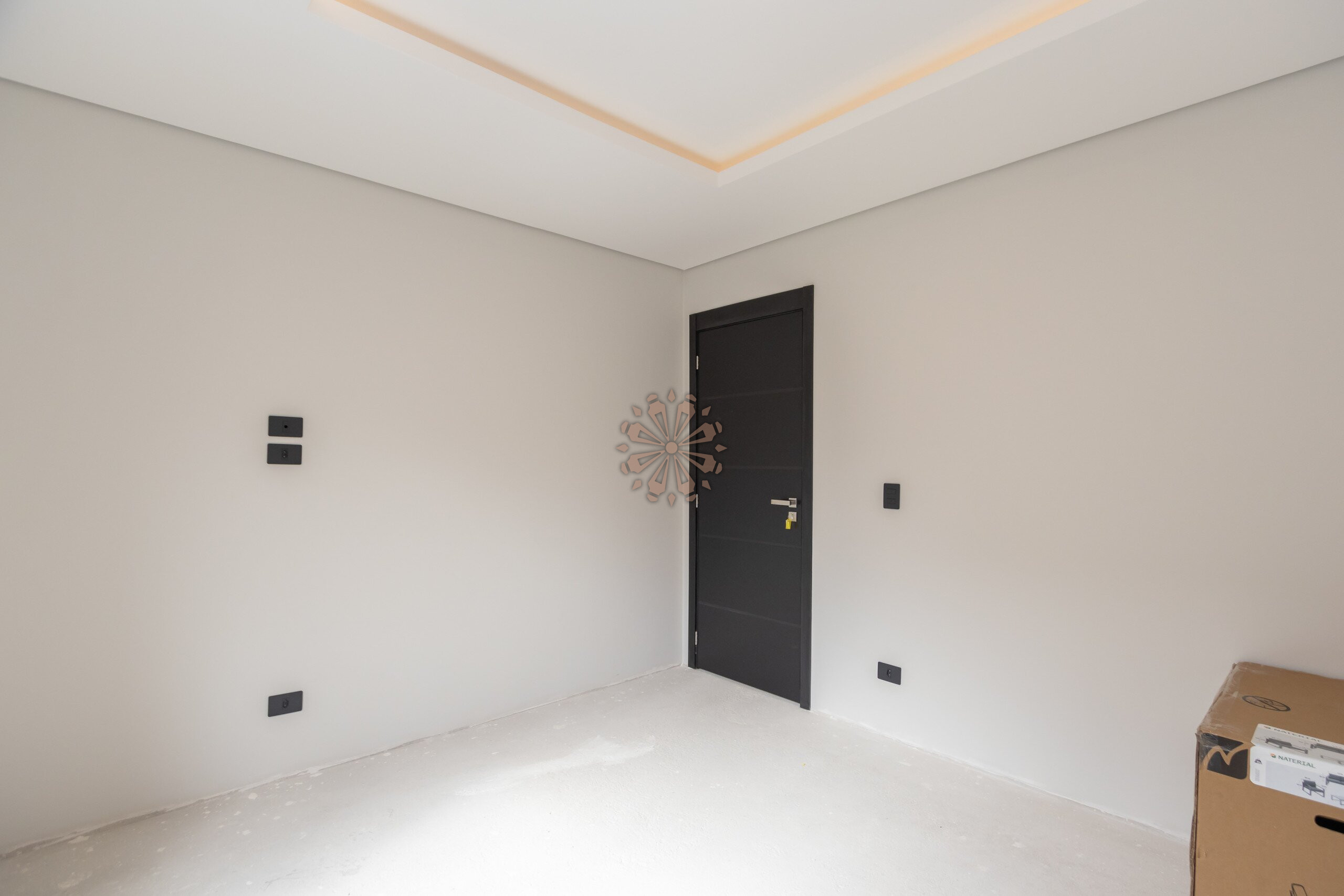 Sala com projeto de iluminação, gesso rebaixado e ar-condicionado em todos os cômodos.
