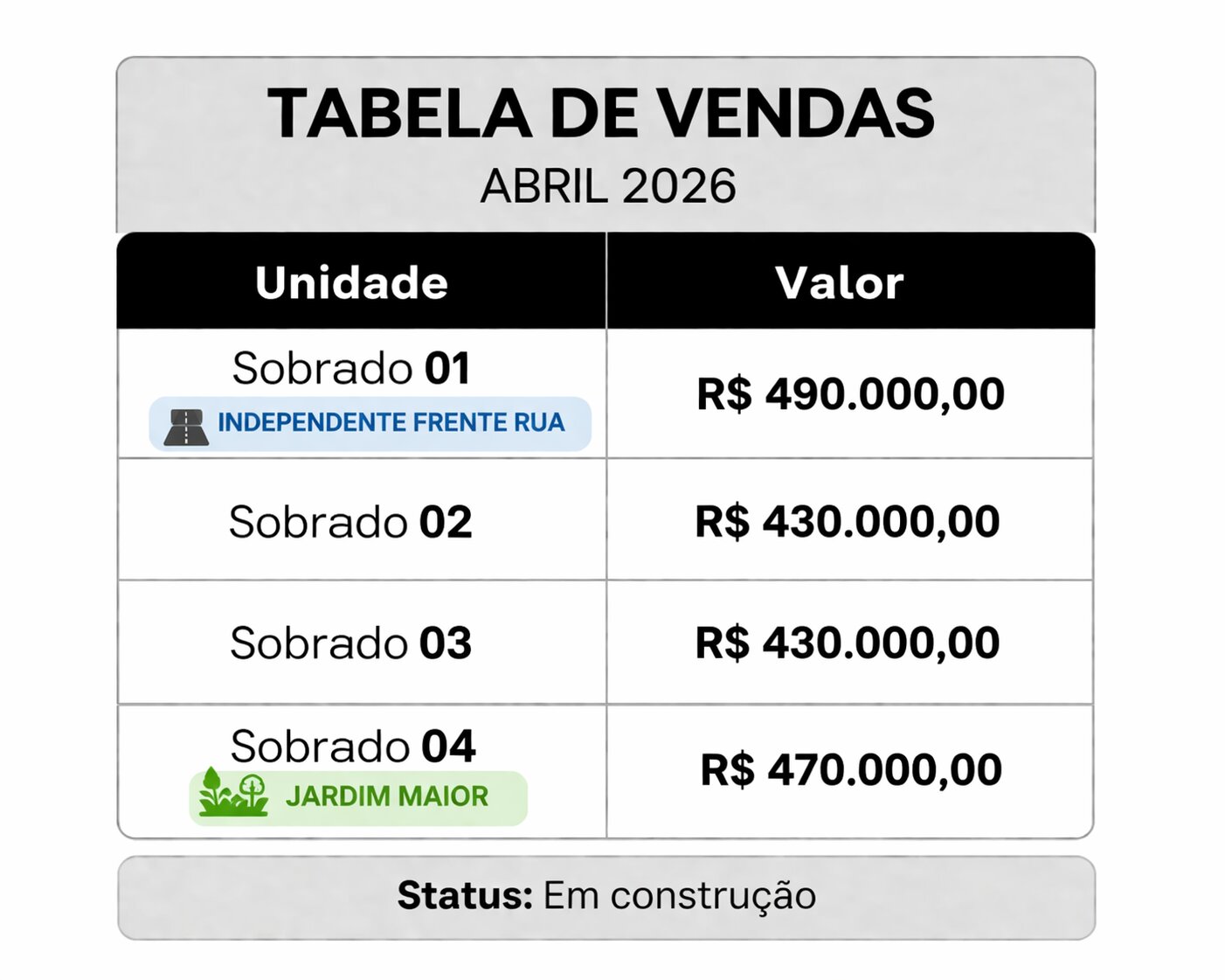 Valores e disponibilidade sujeitos a alteração sem aviso prévio, conforme condições comerciais do empreendimento e legislação vigente. As informações devem ser confirmadas no momento do atendimento, podendo os valores divulgados estar desatualizados.