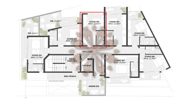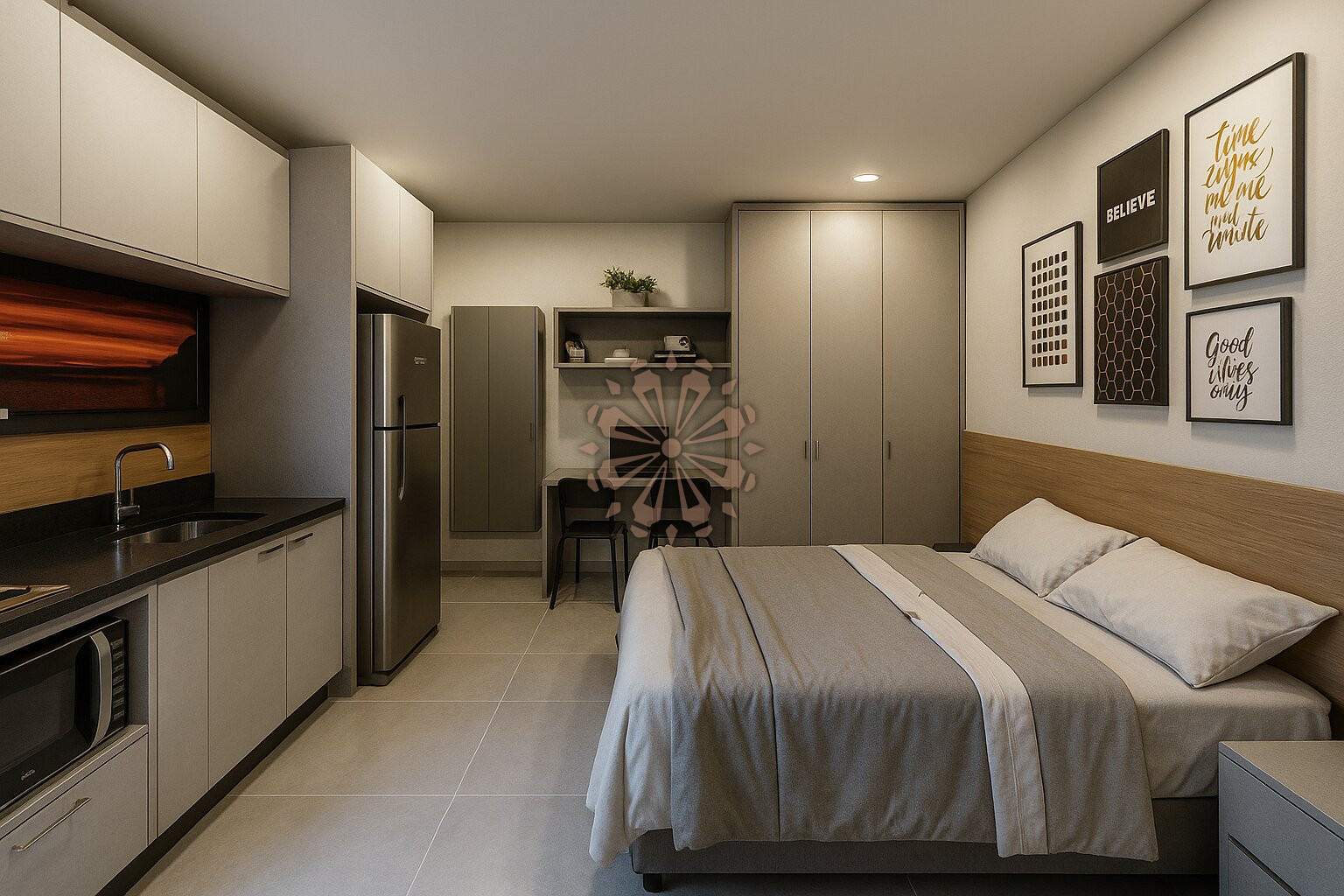 Os studios variam entre 17 m² e 36 m² privativos, com acabamentos de alto padrão, piso em porcelanato, janelas em alumínio e fechadura eletrônica.